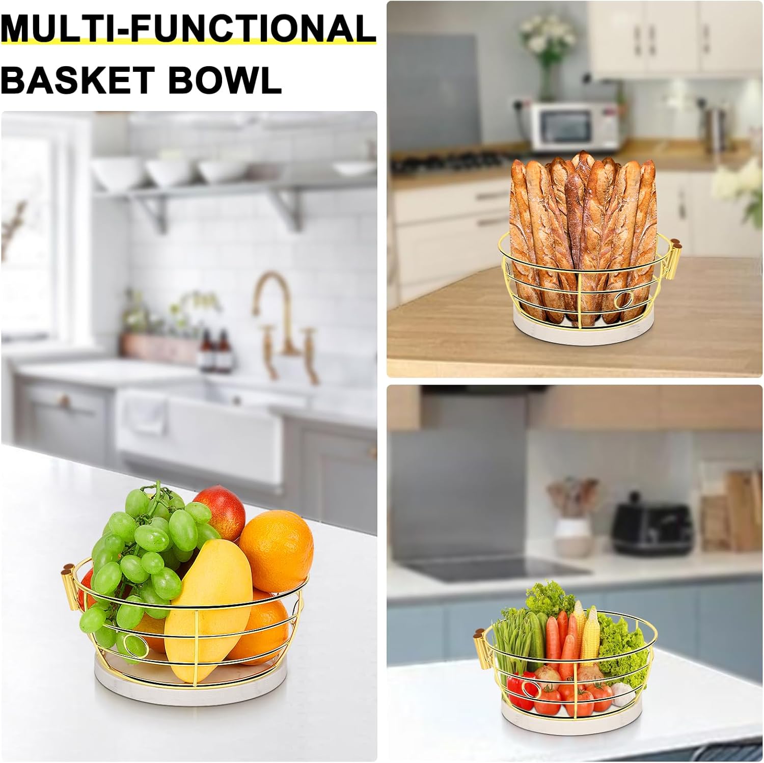 - PERFECT FRUITS STORING: The extra fruit basket bowl is ideal for your apples, pears, grapes, oranges,kiwis, snacks, bread and vegetables. Saving your countertop space and keeping your fruits fresh in your table kitchen.