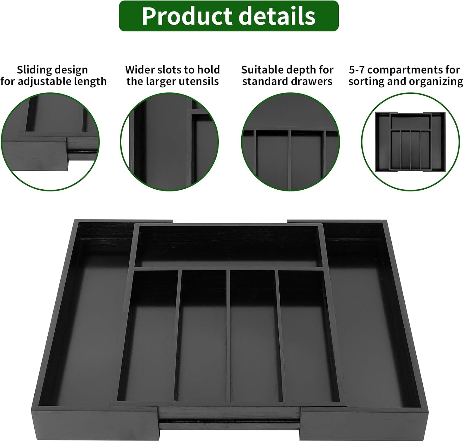 VaeFae Bamboo Drawer Organizer, Expandable Silverware Drawer Organizer, Cutlery Tray with Dividers for Kitchen Utensils (Black, Medium)