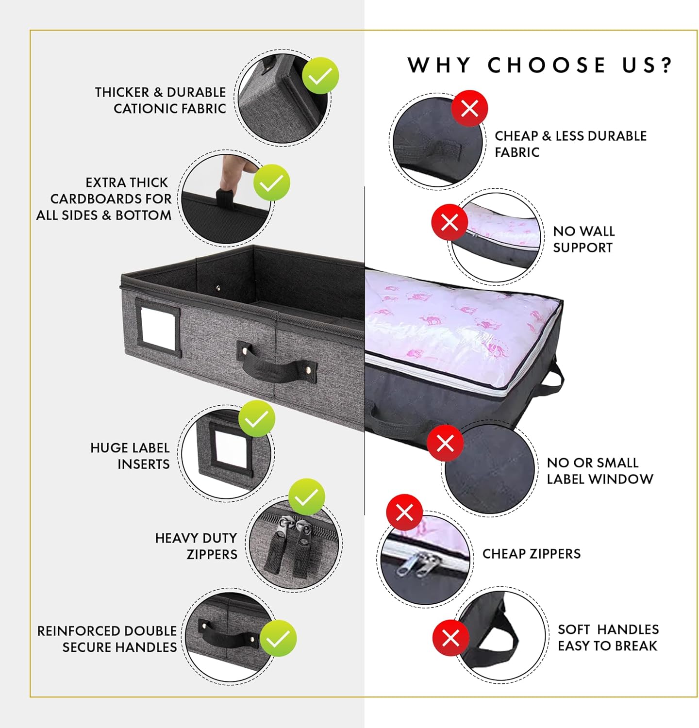 - 𝐇𝐞𝐚𝐯𝐲 𝐃𝐮𝐭𝐲 𝐙𝐢𝐩𝐩𝐞𝐫 𝐂𝐥𝐨𝐬𝐮𝐫𝐞: Committed to safety and organization, our under bed flat storage boxes are precisely tailored. The zipper of our storage containers for under the bed ensures that the items inside are protected from dust and other elements that can cause damage. Our under bed storage with lid are pusposely designed with durability and strength making it ideal for flat clothing storage that require frequent opening and closing, or those that carry heavy loads.