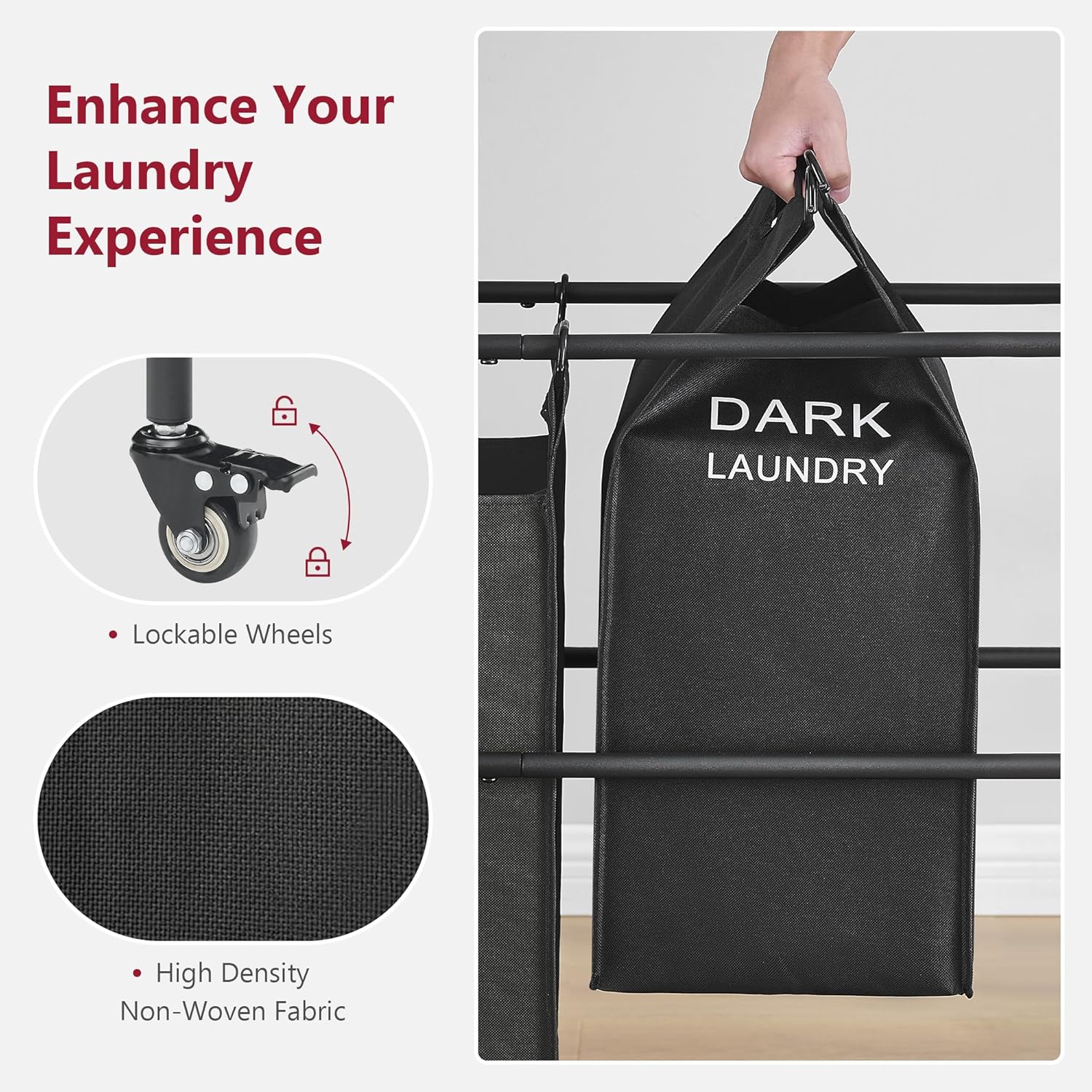 Tajsoon Laundry Sorter Cart with Hanging Rack, Laundry Sorter 3 Section, Laundry Hamper with Heavy Duty Rolling Lockable Wheels, Black