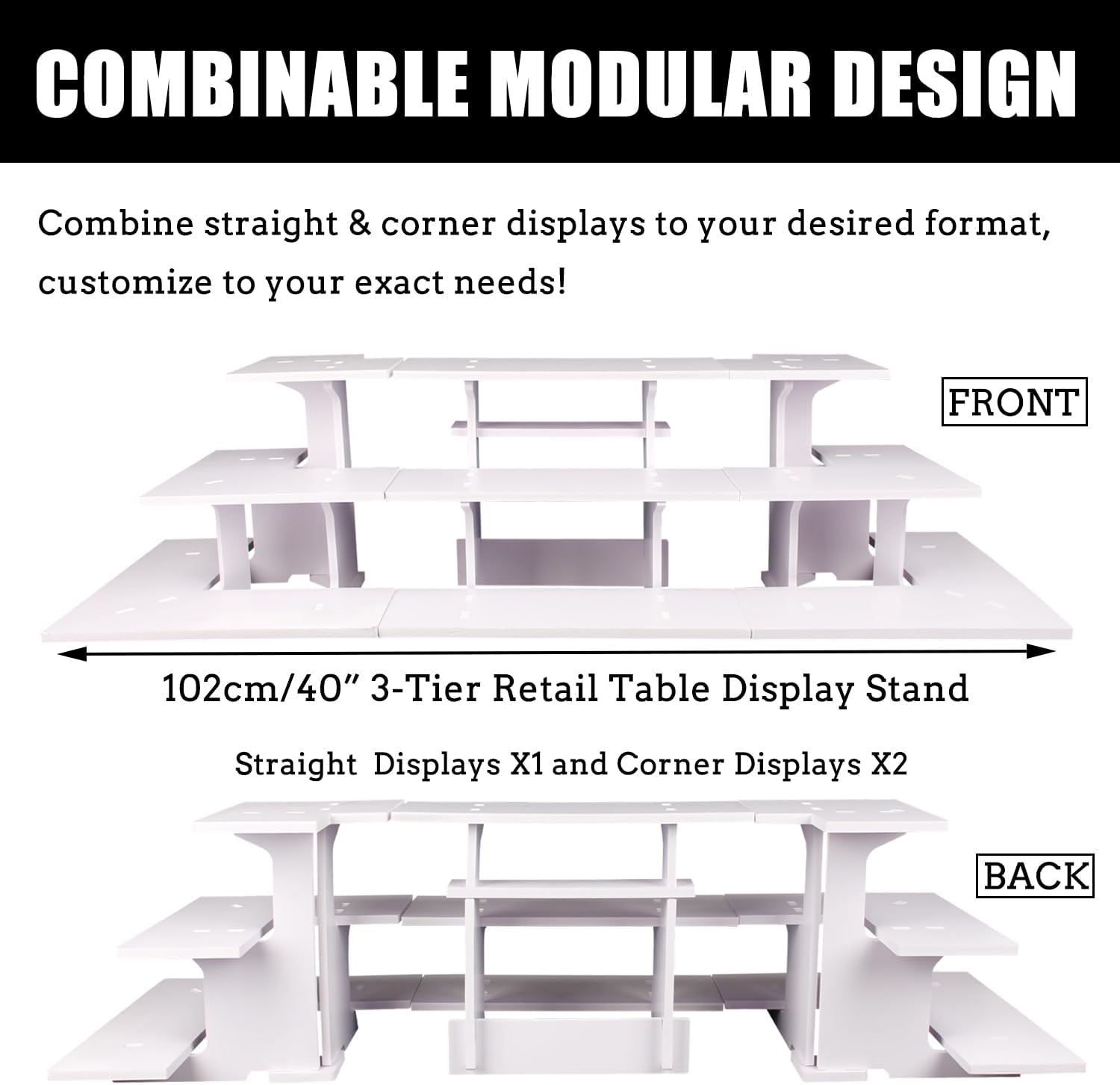 - CUSTOMIZATION FRIENDLY: You can combine corner display and straight display to your desired format, customize to your exact needs this display stand! 1 set of straight display and 2 set of corner display can be combined into a set of 40 inch long 3 tier retail table risers display stands, perfect for farmers markets, craft fairs and pop up shop, vendor booth display items or office and home use!