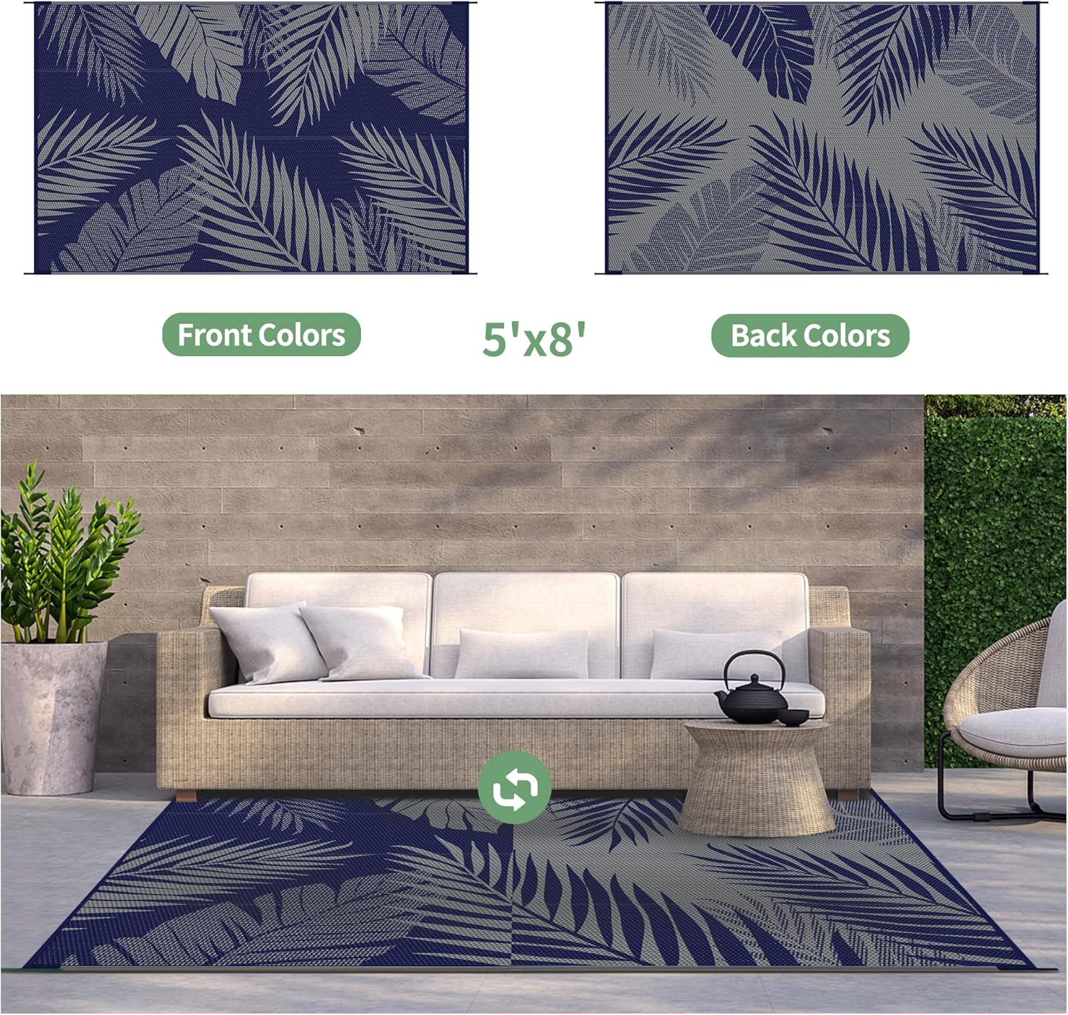 GENIMO Outdoor Rug 5' x 8' Waterproof for Patios Clearance, Reversible Outdoor Plastic Straw Camping Rug Carpet, Large Area Rugs Mats for RV, Picnic, Backyard, Deck, Balcony, Porch, Beach, Blue&Grey