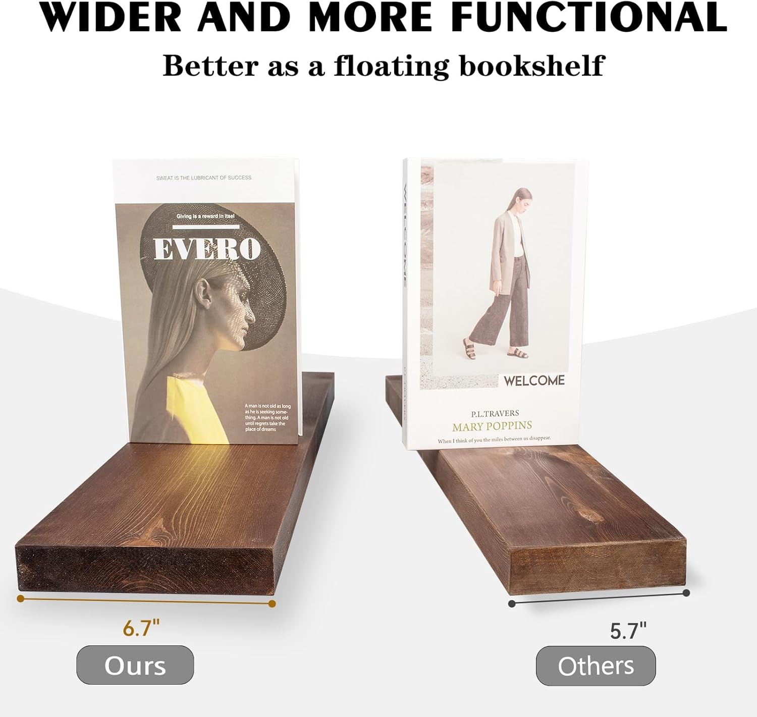 - PERFECT SIZE: Each floating shelf is 6.7" deep, which means they can hold most books without taking up too much space. It makes full use of empty walls and makes the room look bigger and neater