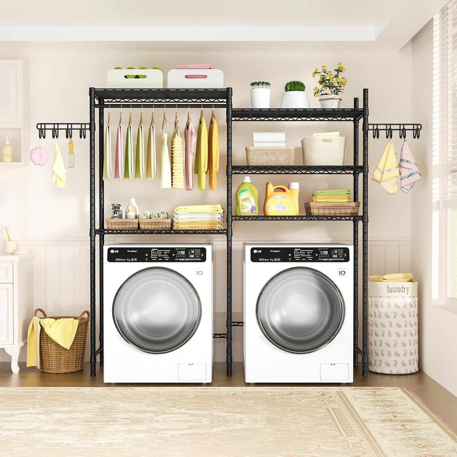 - [Customizable Assembly]: Adjust the shelves installation position to fit your washing machine type. You can custom to use the shelf quantity and the hanger rod installation position