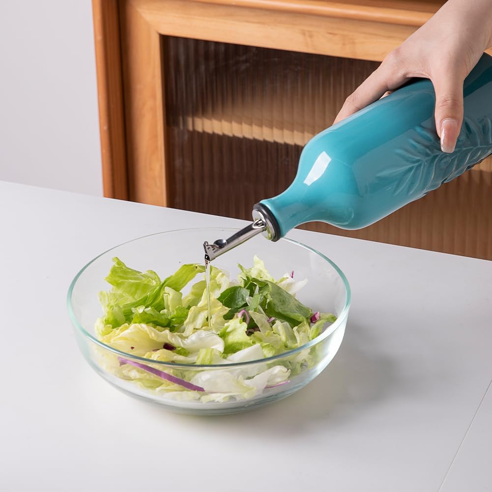 - Modern Relief Design -The bottle body is embossed with olive leaves, which looks elegant and delicate.Precision dumping, bottle body design has a unique spout, can perfectly pour out the oil and vinegar will not leak, the correct control of the use of oil.