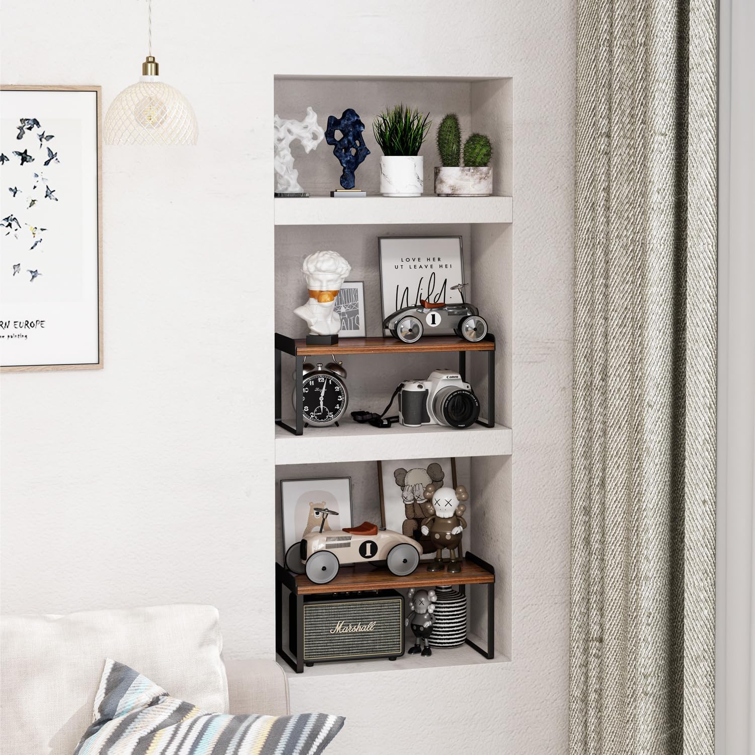 - Scalable Storage System: One is perfect for a nice coffee station, but you can truly maximize your space with multiple shelves placed side by side or stacked vertically. Designed with raised metal edges allows additional shelves to be stacked on top without additional hardware.