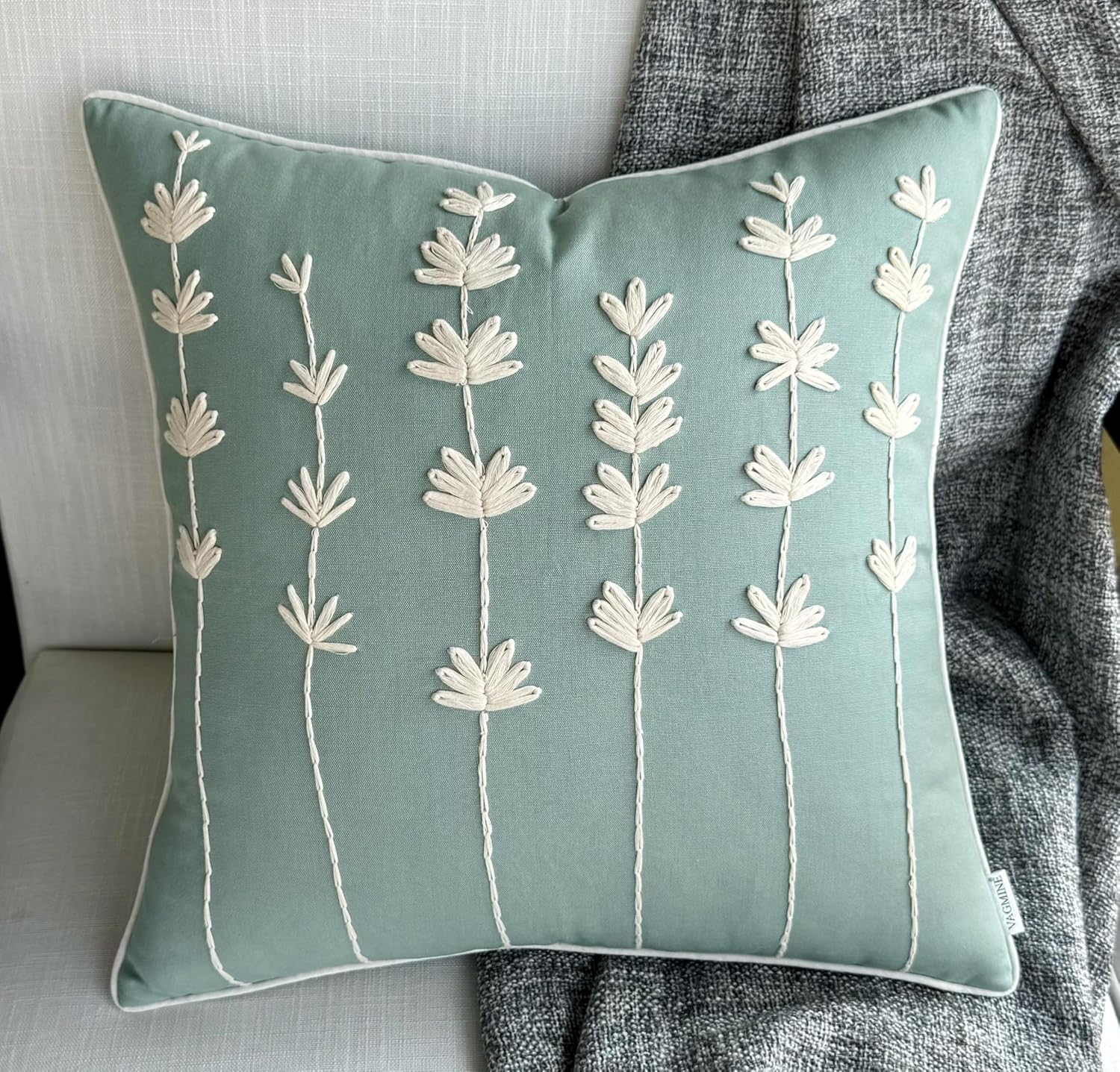 VAGMINE Hand Embroidered Daisy Accent Throw Pillow Cover - 18x18 Inches Square - 100% Cotton Light Teal Decorative Cushion Cover for Couch, Sofa, Bed - Textured Embroidery - Elegant Floral Home Décor
