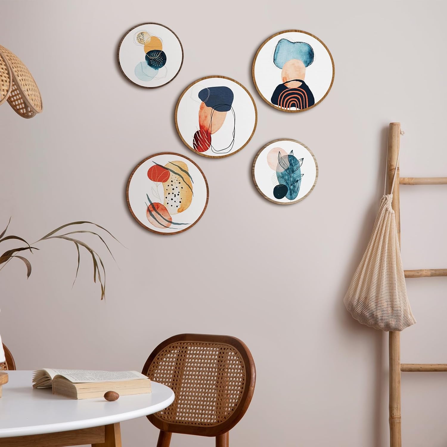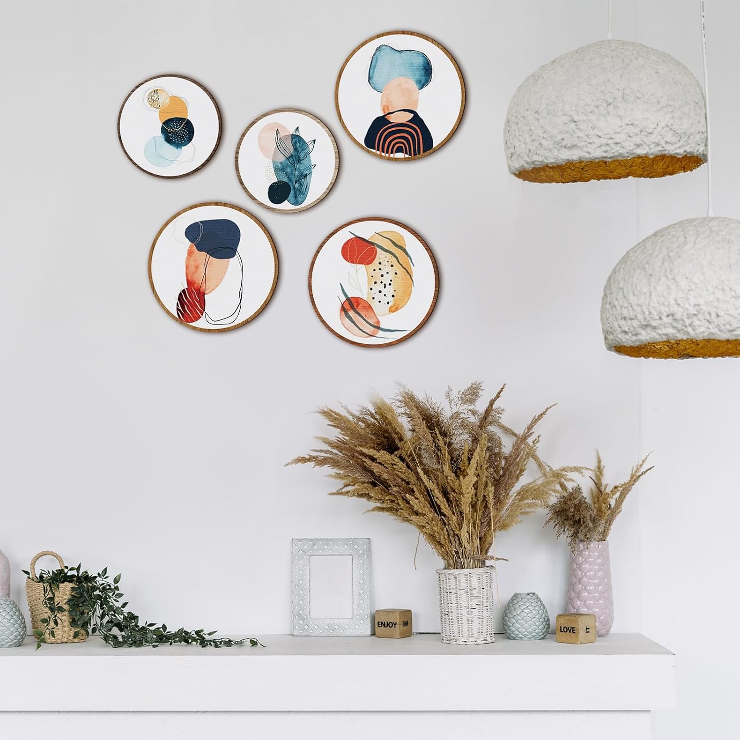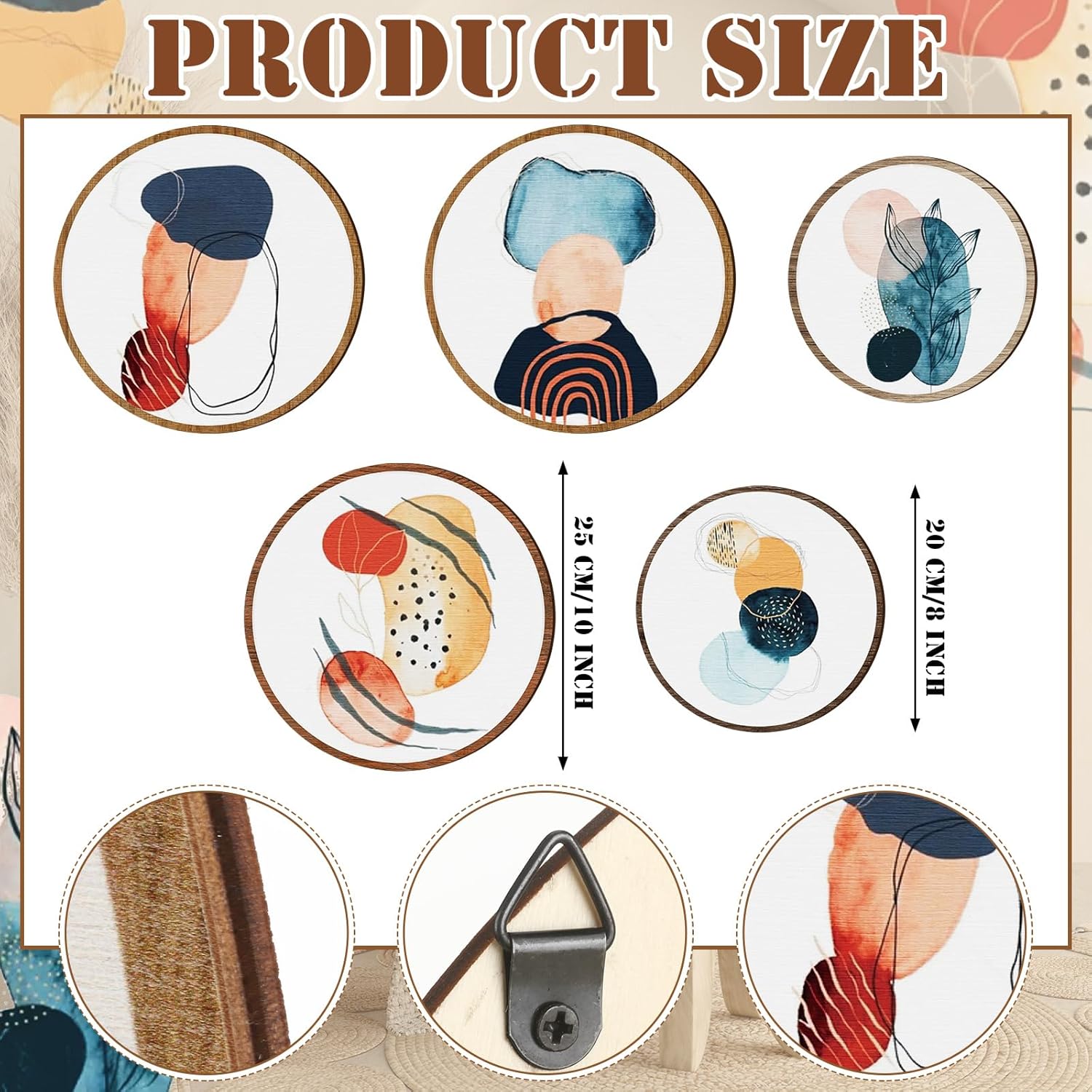 - Proper Size for Display: there are 2 kinds of sizes of the aesthetic wall art, 3 bigger ones measure about 10 inches/ 25 cm in diameter, and 2 smaller ones are about 8 inches/ 20 cm in diameter, all of them are about 0.2 inch/ 0.5 cm in thickness, proper size to catch people's attention