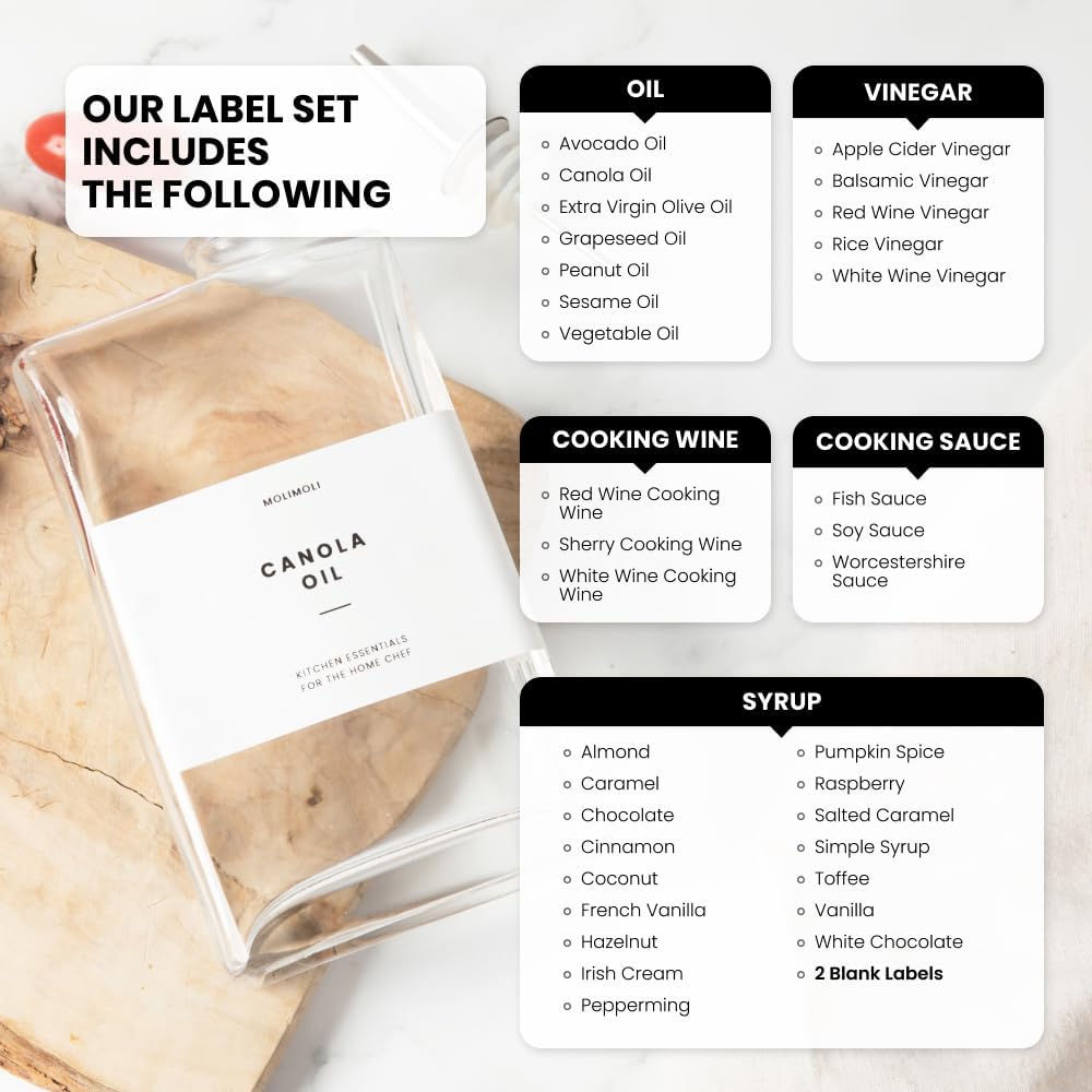 - Labels Free of Oil Stains: Each Oil and Vinegar Dispenser Set Has 42 Complimentary Waterproof Stain-free Labels. The Labels Are Designed To Be Reused for Multiple Times and Will Not Leave any Residue upon Peeling.