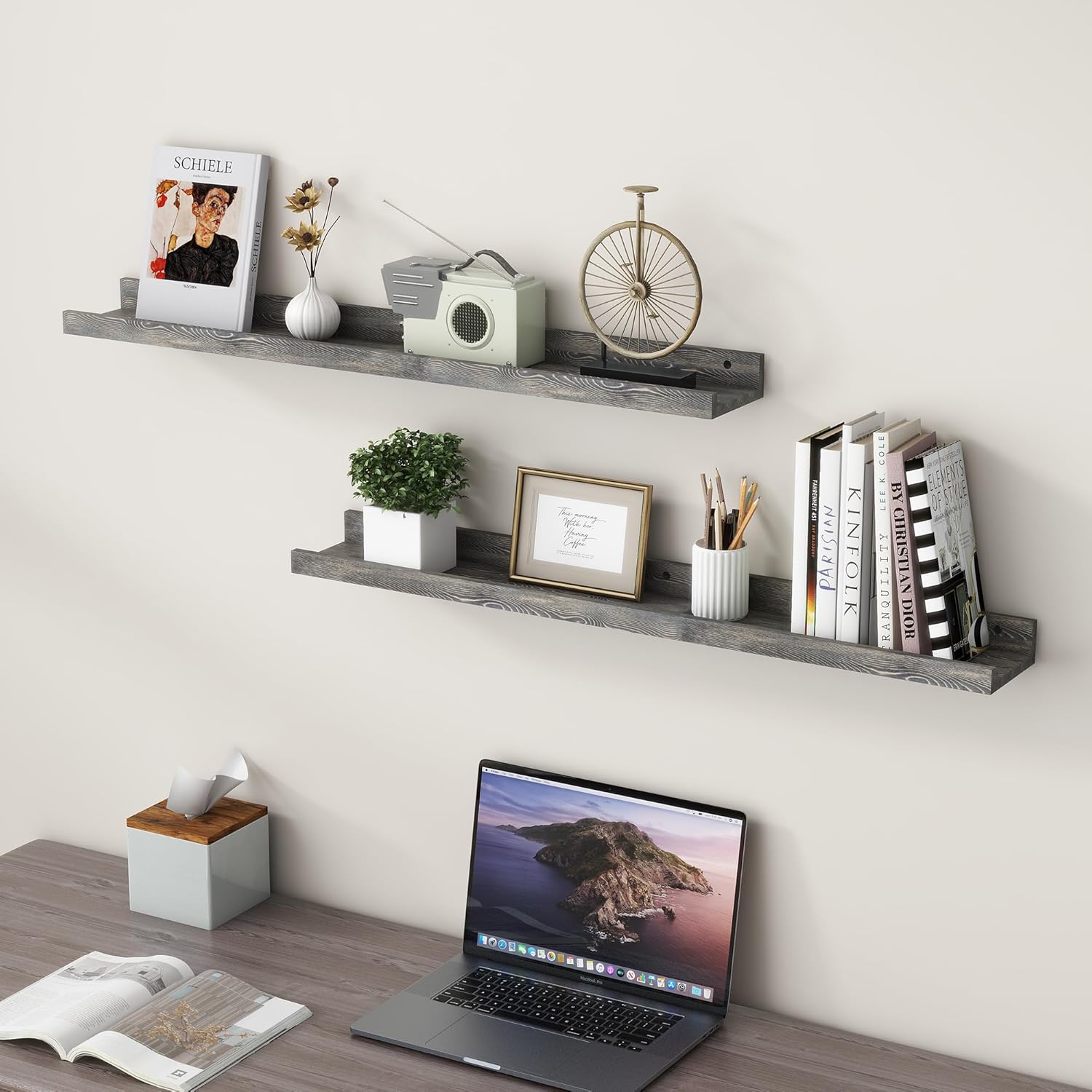 - Easy to Install: You will get a level, screws for the wall, drywall anchors, a detailed installation guide, and two beautiful hand-crafted solid pine wood shelves. With the level, you can make sure your picture ledge shelves are well aligned. Just follow the simple instruction to install the hanging shelves for wall decor within 10 minutes. We add additional screw and anchor to the hardware bag just in case. If you have any questions about our products, please feel free to contact us