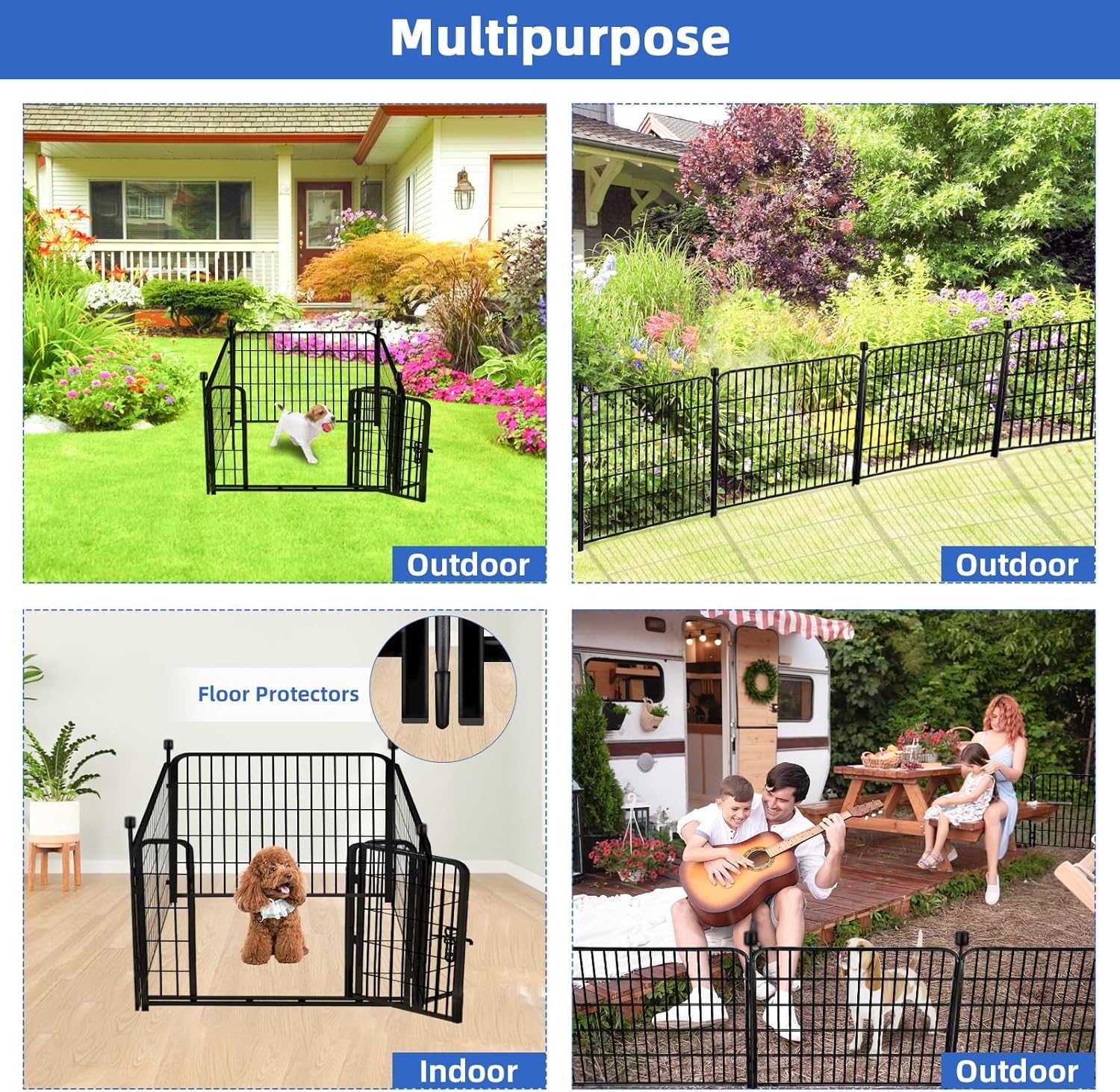 - Wide Application: 1)This Decorative Garden Fence is Suitable as a Lawns, Vegetable Garden Borders . 2)The Fences Can be Used as Outdoor Pet's Fence, and It also Can be Used as Indoors Dog Playpen, the Bottom of The Pole is Fitted with An Anti-friction Sleeve, That Won't Scratch Your Floors. 3) As Camping Fence When You RV Trip