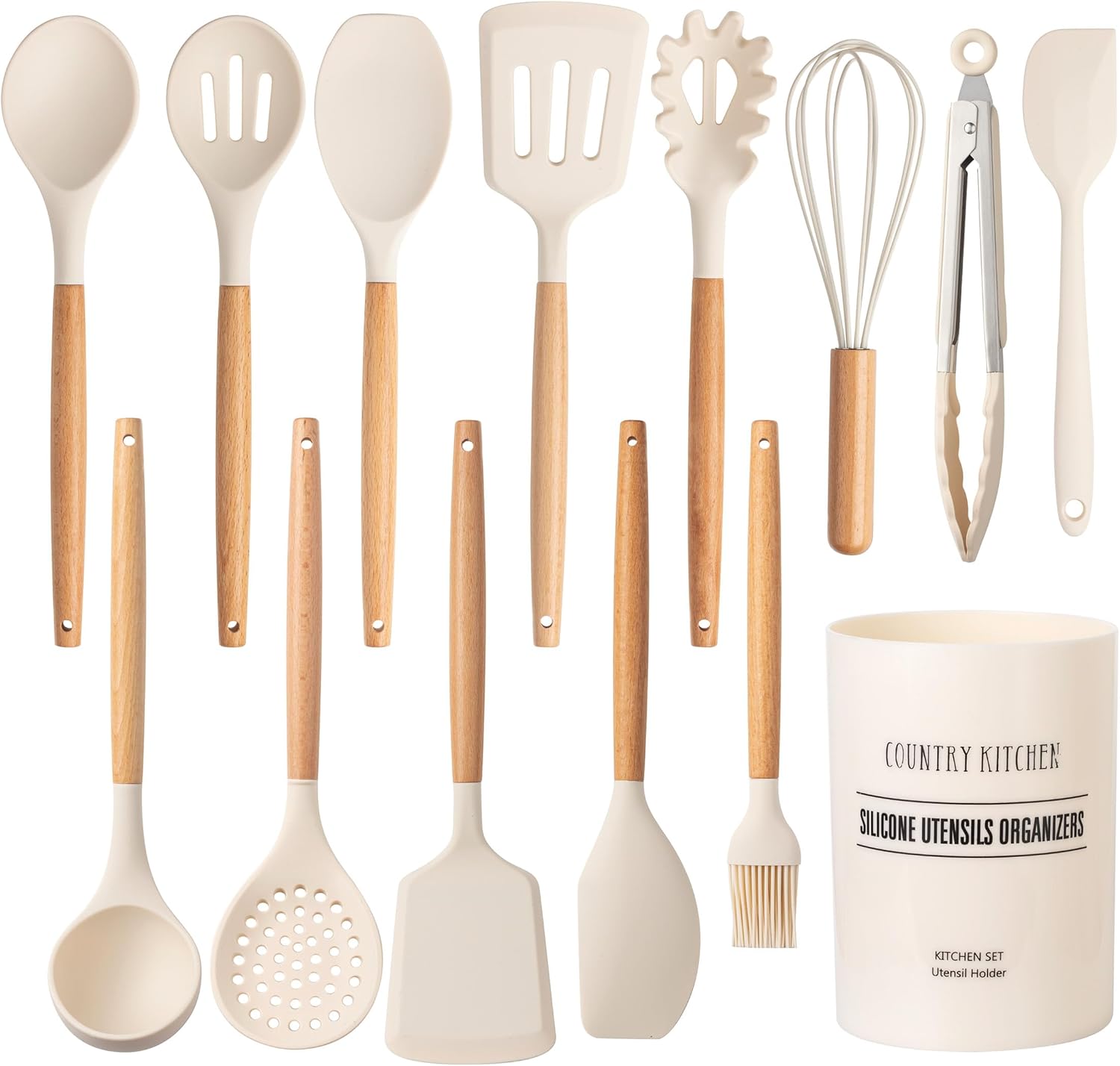 Country Kitchen Non Stick Silicone Utensil Set with Rounded Wood Handles for Cooking and Baking, 14 Piece Set, Khaki