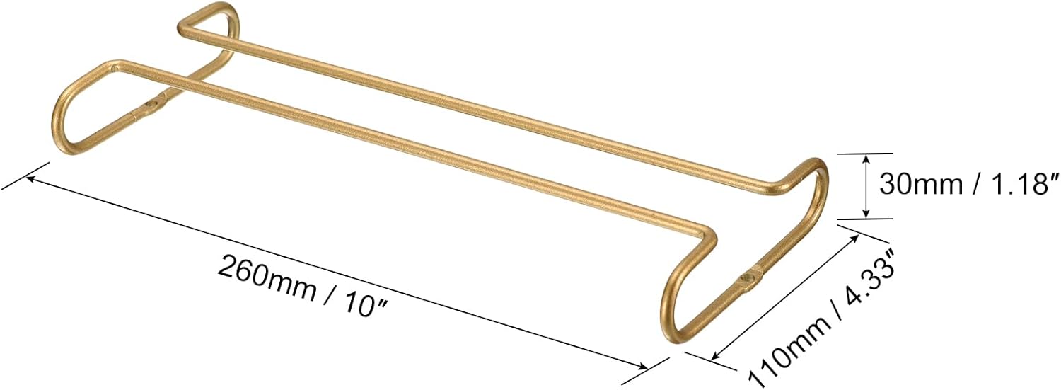 - [Style and Size] This wine glass rack is a single-row metal wine holder; Size: 260x110x30mm/10"x4.33"x1.18"(LxWxH); Material: Stainless Steel; Opening Diameter: 5mm; Color: Gold; Products Include: 4pcs x Under Cabinet Wine Glass Holder