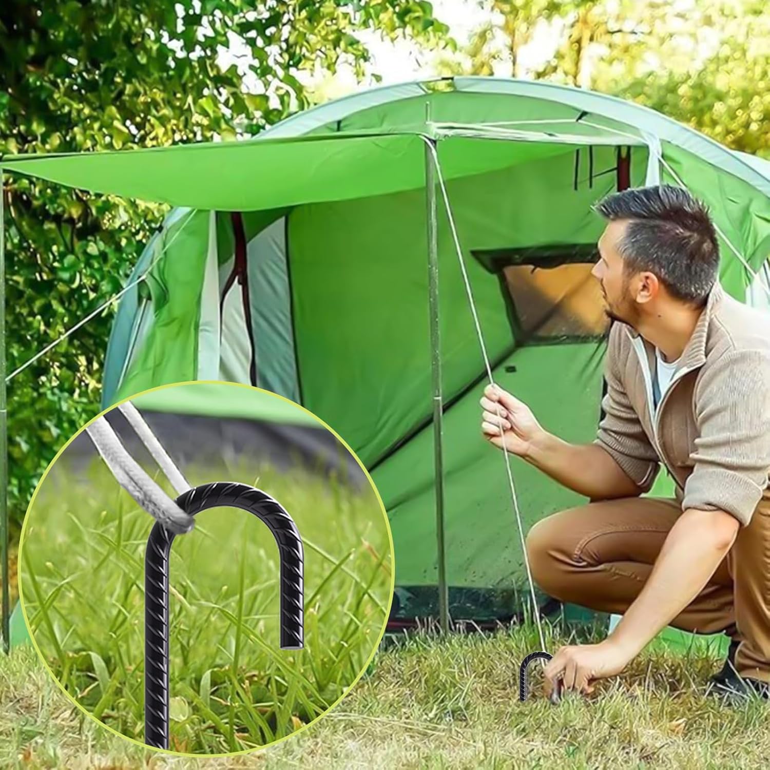 - MULTIPLE USES - Hammer these J hook rebar ground stakes in to secure the bottom of chain link fence, trampoline, fence, camping tent, trap, garden/lawn edging, swing set, inflatable, yard decorations, canopy, wire fence, trapping and so on, stop the tents from slipping away in winds.