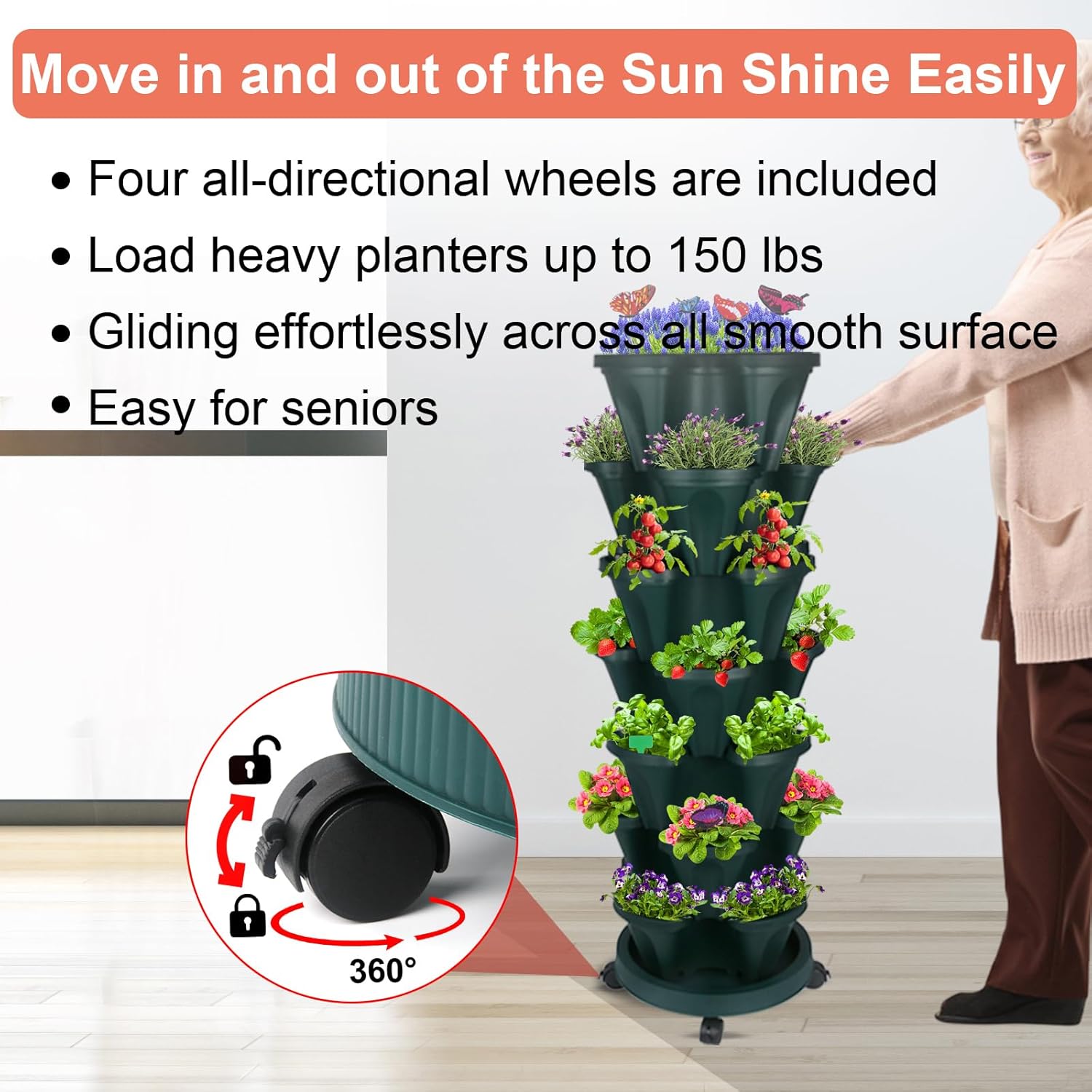 DUNCHATY Stackable Planter, Vertical Strawberry Planter with Garen Tool Set, Self Watering Garden Planter Indoor/Outdoor 7 Tier Herb Planter Pots for Growing Vegetables and Succulents, Pine Green