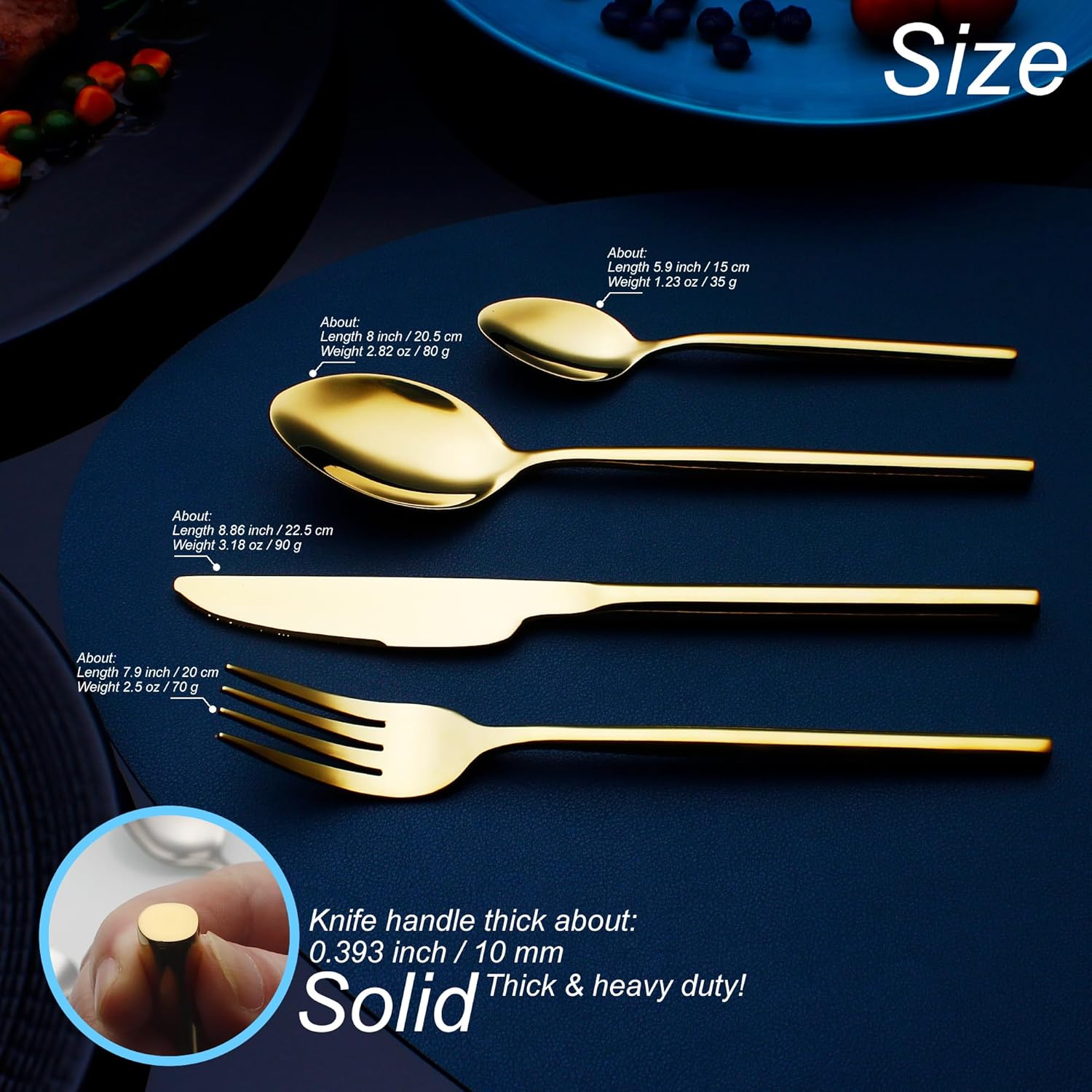 - Sleek & Elegant design utensil sets: Luxury modern round handle shape highly mirror polished finished fine & natural.Surface without grain smooth and sleek easy for clean. Thick and solid weighted well balanced,it’s a pleasure to grip that upgrade your dining experience.