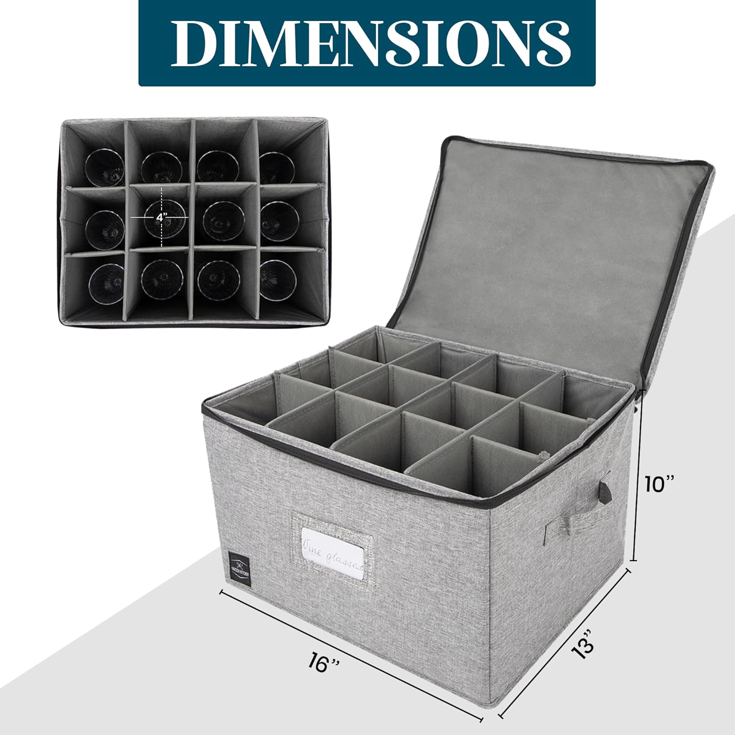 - STACKABLE GLASSWARE STORAGE CHEST: Designed for convenience and protection, this stackable glassware storage chest holds up to 12 wine/stemware glasses. This storage case is 16" W X 13" D X 10" H. Each interior compartment measures 4" X 4" and is equipped with removable padded dividers to ensure secure storage and safeguards against chipping or scratching. Glassware shorter than 10β, including beer glasses, can also be transported and stored in this storage box.