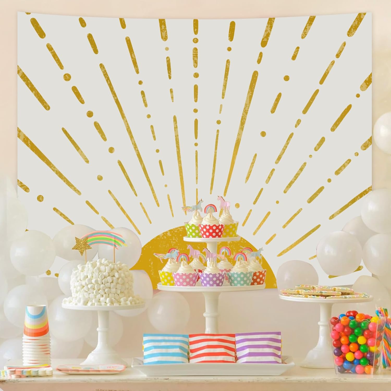 Kanuyee Gold Boho Burning Sun Tapestry Wall Hanging, Retro 70s Abstract Vintage Geometric Line Sunrise Tapestries for Bedroom Living Room Backdrop 36×48 inch
