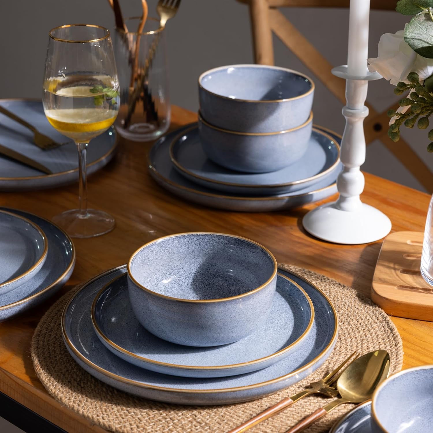 GBHOME Ceramic Dinnerware Sets for 4, 12 Pieces Stoneware Plates and Bowls Sets, Scratch Resistant Dishe Set for Dinner, Dishwasher & Microwave Safe, Brunnera Blue