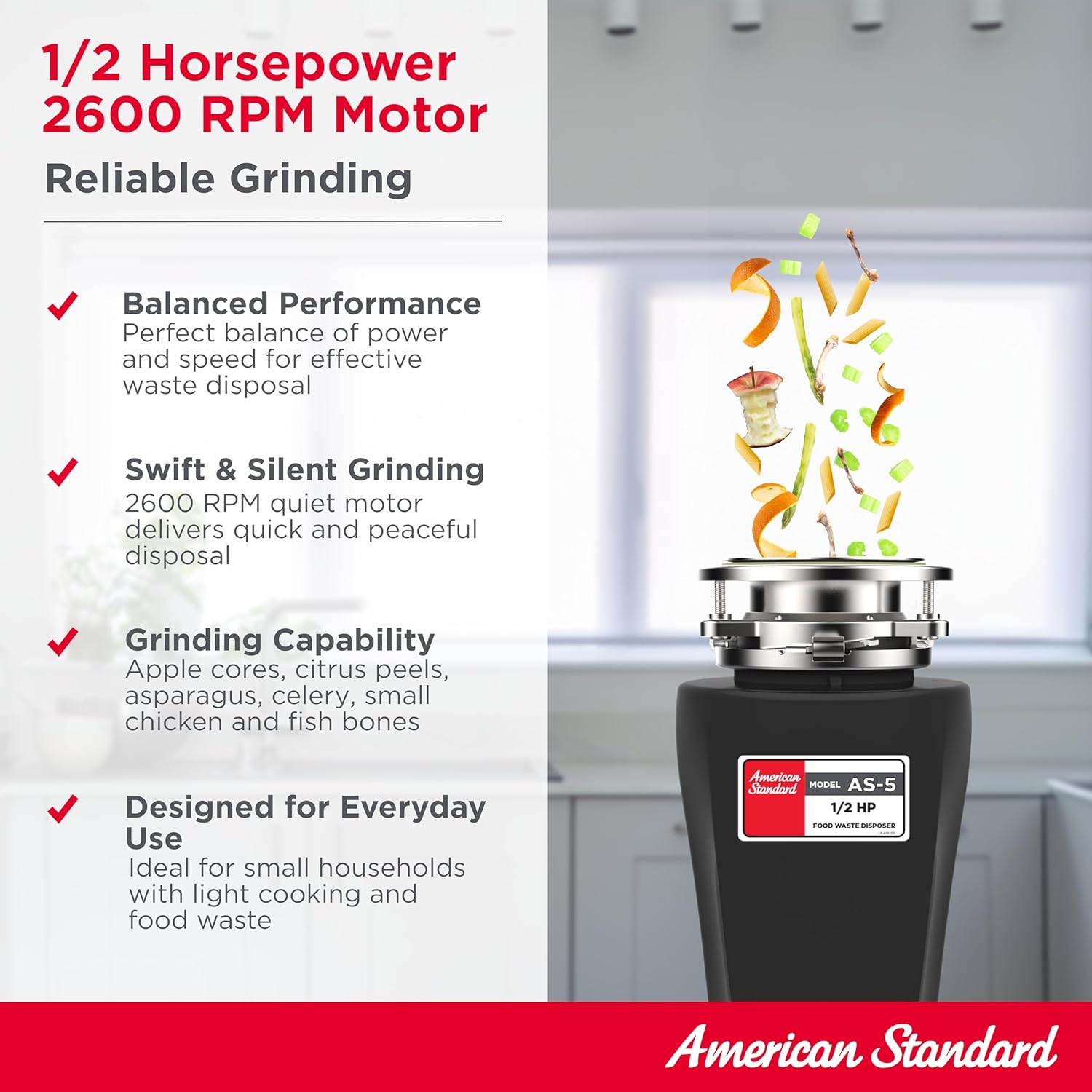 - VERSATILE GRINDING: American Standard garbage disposals handle a wide range of food waste, including soft & tough items, grinding them into fine particles that easily pass through your plumbing system and is safe for septic tanks. This makes it suitable for various kitchen needs
