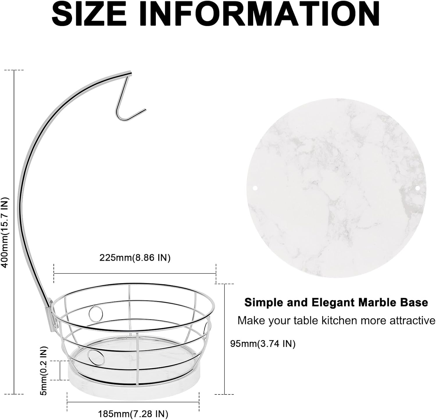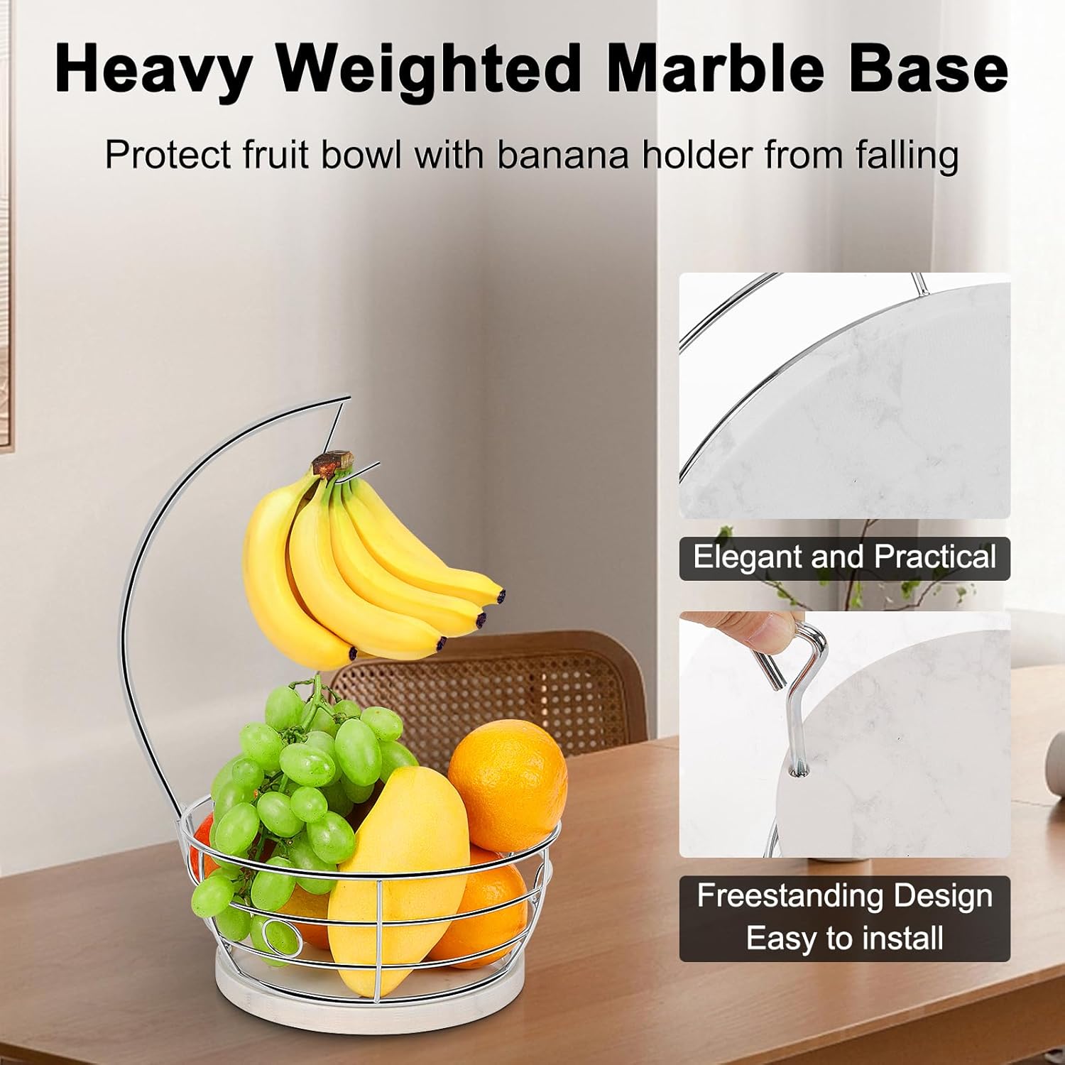 Livabber Countertop Fruit Basket Bowl with Banana Hanger, Modern Standing Fruit Vegetable Bowl Storage, with Banana Tree Holder for Kitchen Dinning Table (Round Marble, Chrome)