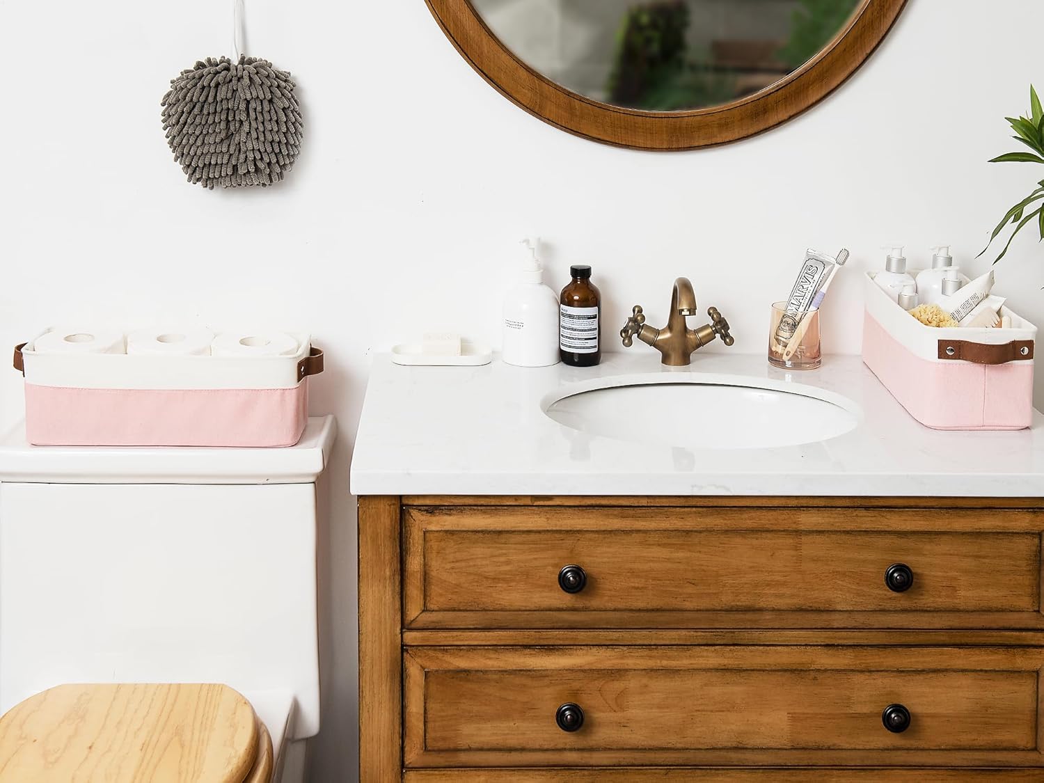 StorageWorks Narrow Storage Bins, Small Basket for Closet and Shelves, Fabric Organizer with Handles, Toilet Paper Storage, Pink and White, 2-Pack