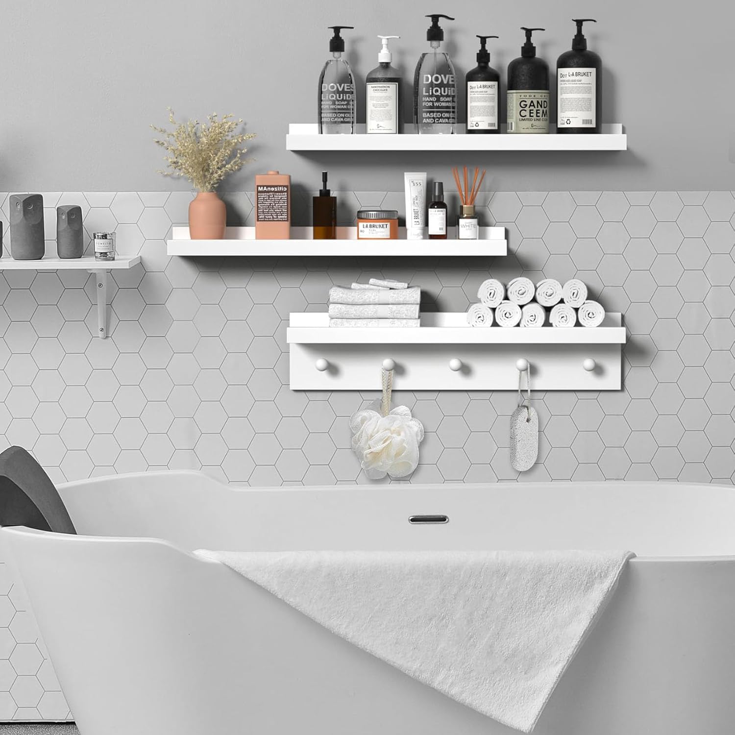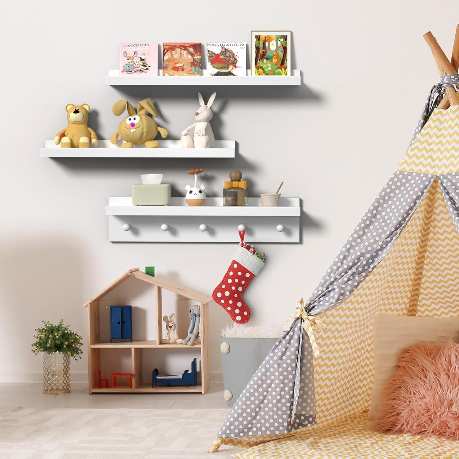MBYD Picture Shelf Ledge, 24 Inch Floating Shelves for Wall, Nursery Book Shelves with Hooks Set of 3, Floating Shelf Wall Mounted for Bathroom,Kids Room, Living Room, Kitchen Bedroom White