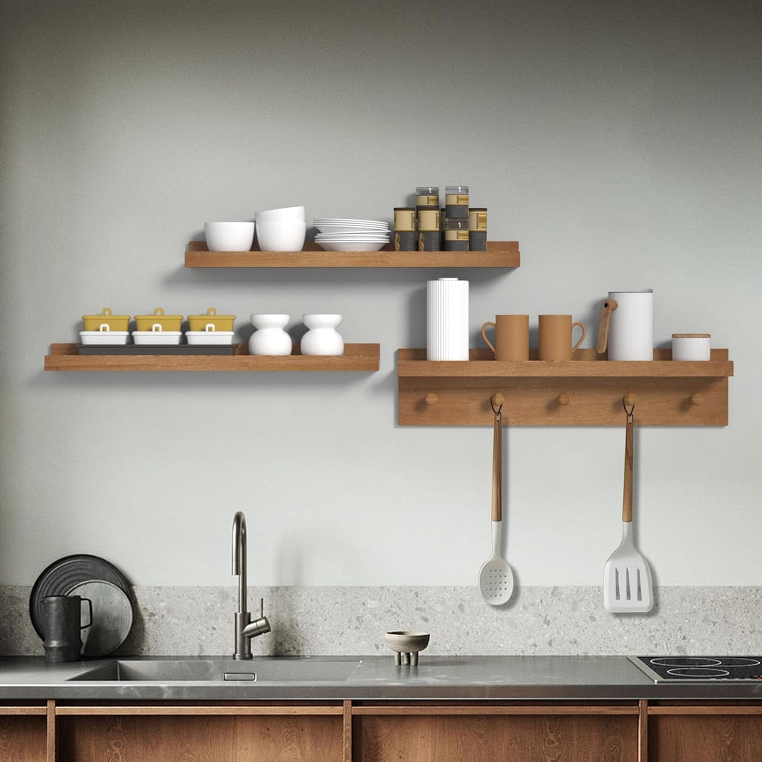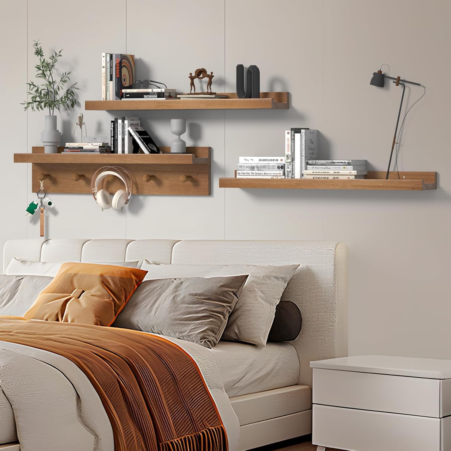 - Customizability: A set of 3 picture ledges, including floating shelves with hooks and photo ledge shelf, can be easily cut and adjusted to fit different sizes and shapes, catering to specific spatial requirements.