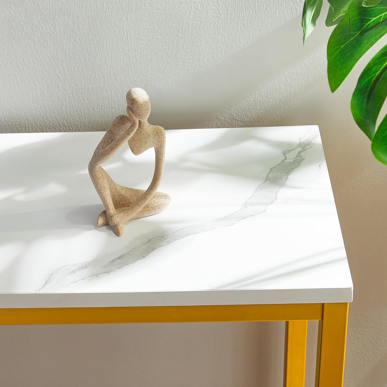 - Movable Panel with All-match Design: The wooden top board is removable, so you could screw it on the right or left to adapt your various outlet in the house, while its white marble texture and bright yellow metal design integrate the sleek wood with a metal table structure suit for most decoration styles in apartments, dorm rooms living rooms hallway, etc