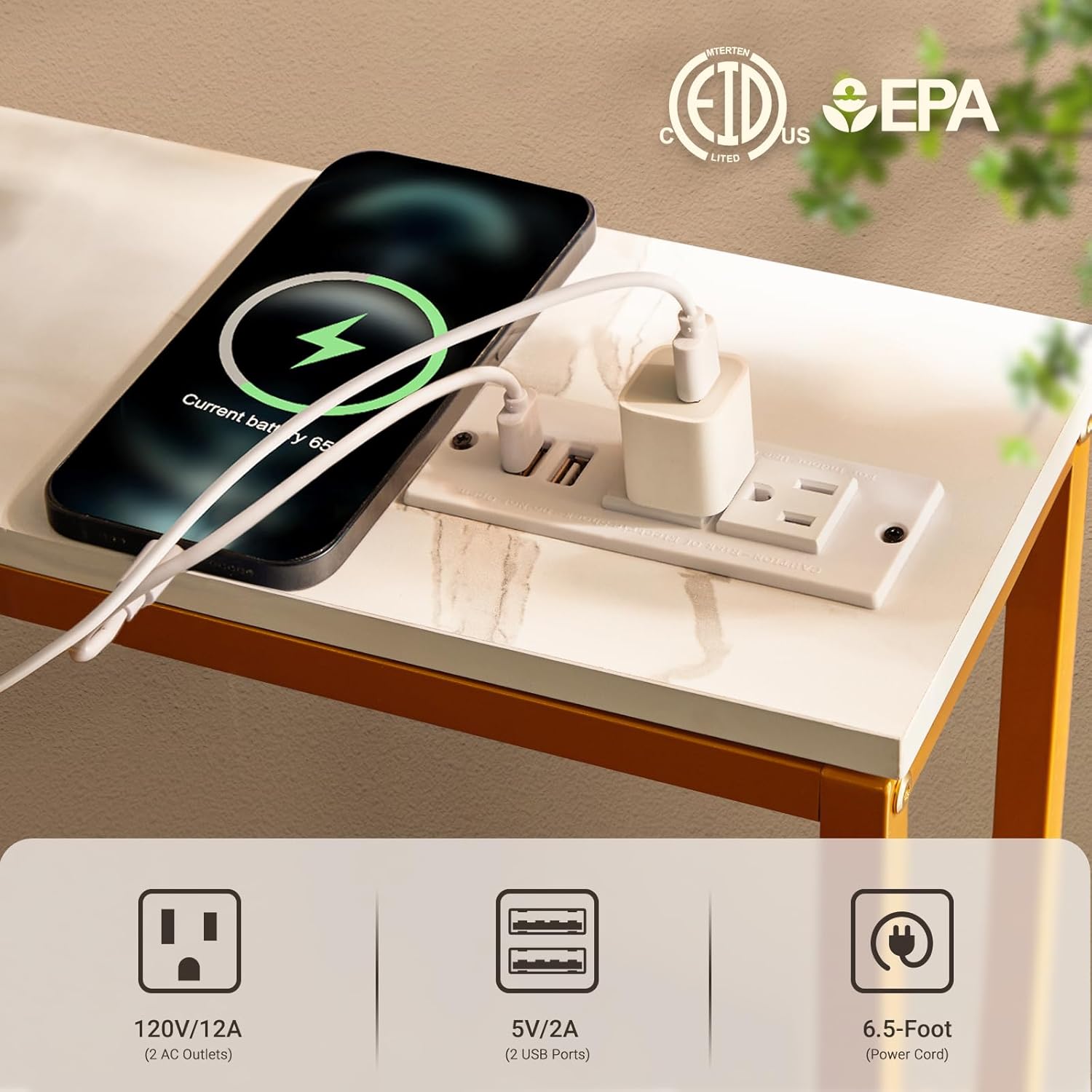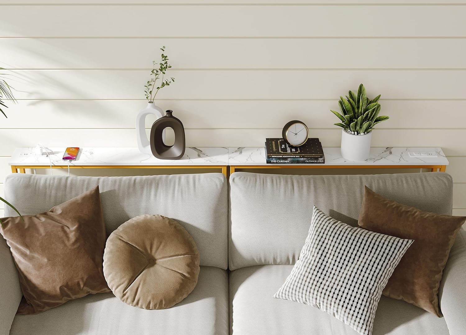 - Back Sofa Table with Outlets: The narrow long table with 2 standard 120VAC outlets, 2 USB ports, and 6.5 feet long power cord to rescue the socket behind the sofa to charge the laptop/mobile phone