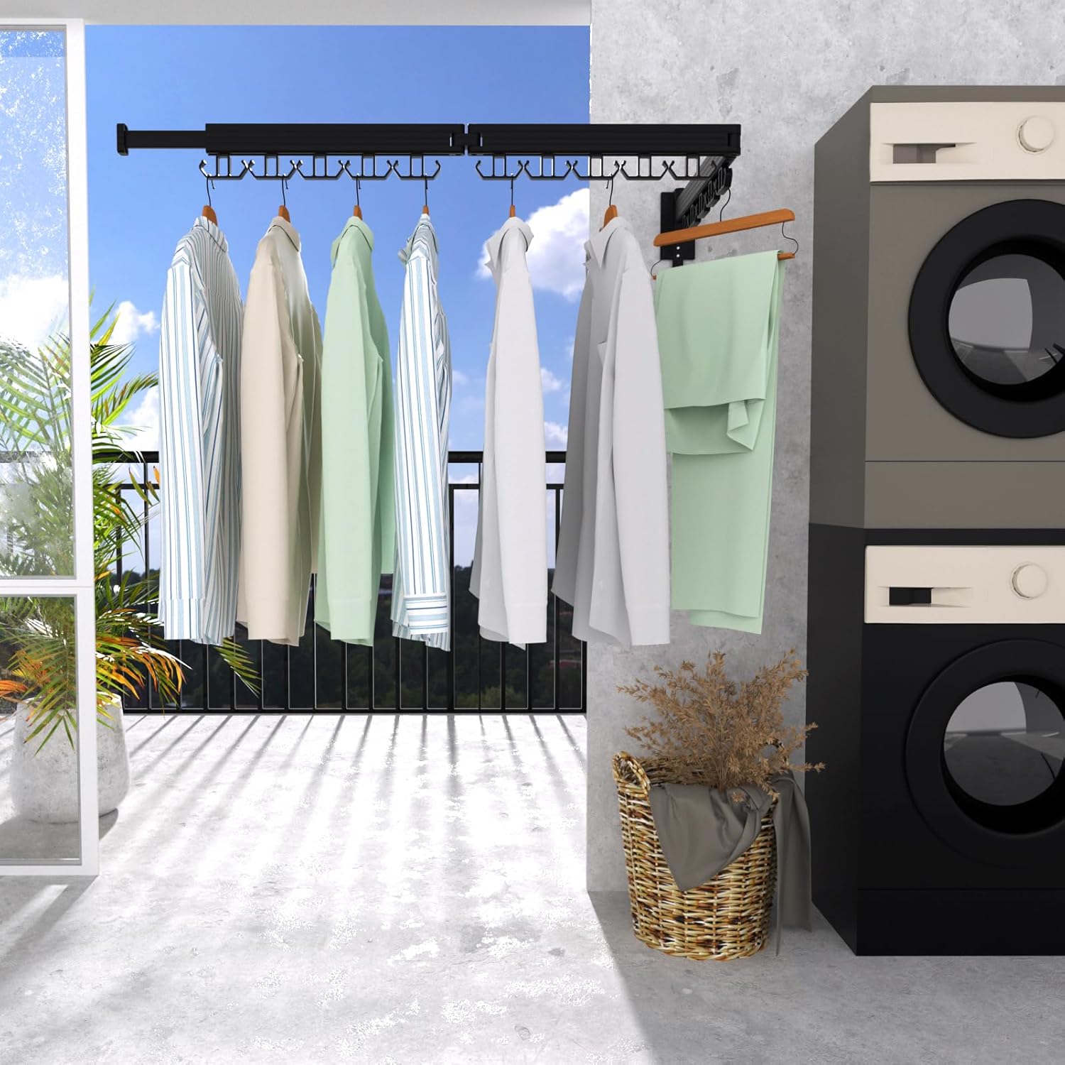 - β Wall Mounted Drying Rack -- Our wall-mounted clothes drying rack will maximize your space, since it featuring 3 folding sections & a hidden telescopic rod. It is an ideal option for drying various garments such as shirts, towels, socks, hats, coats, suits, dresses, and much more. Its compact and stylish design efficiently aids in organizing your laundry room.