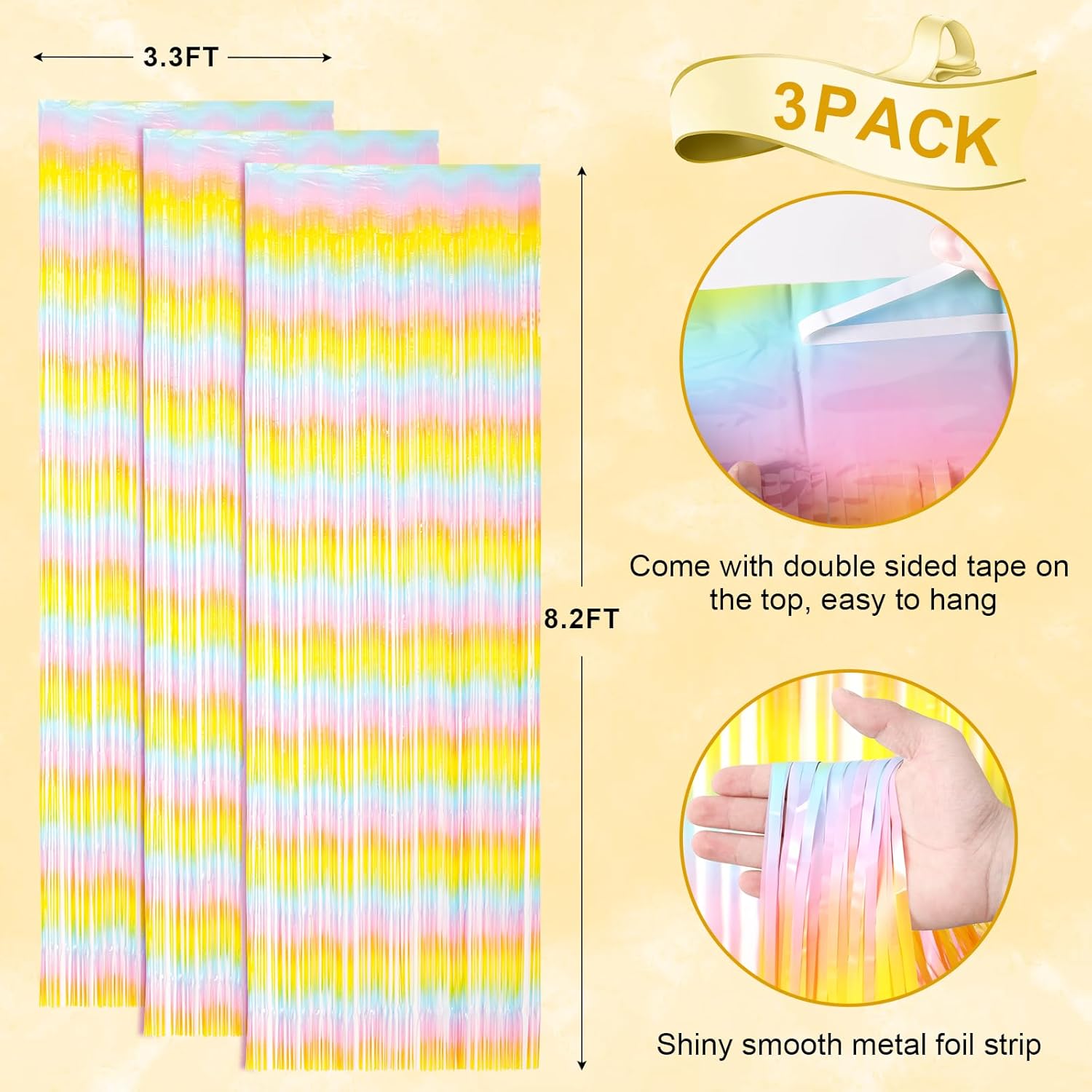 - Premium Material: This Pastel Rainbow foil curtain backdrop is made of stable tinsel, non-fading, stay shiny and reusable. Unfold it and then enjoy your glittering party