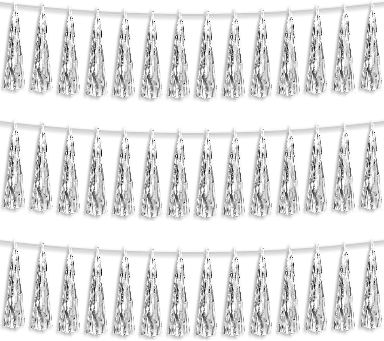 3P Silver Foil Fringe Metallic Tassel Streamers Banner Tassel Garland for Parade Floats, Bachelorette, Wedding, Birthday, Halloween, Christmas, Bridal/Baby Shower Party Decorations