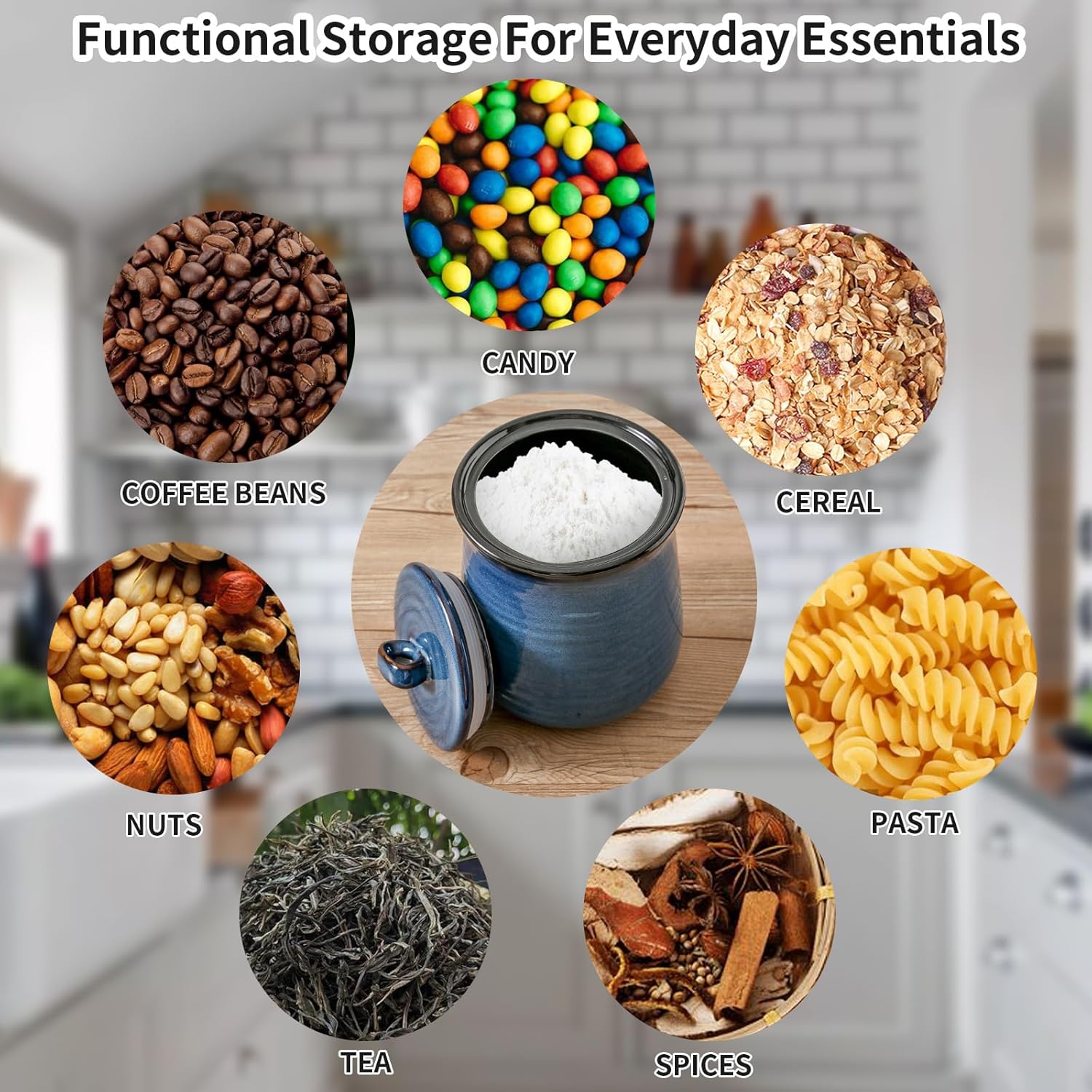- LARGE KITCHEN CANISTER: Our ceramic jar measures 6.2*6.2*8.2 inch and the capacity is 88 oz/ 2500 ml. With generous food storage capacity, this kitchen canister can use to store flour, sugar, coffee bean, tea, biscuit, candy, spice, seasoning or dog treat.