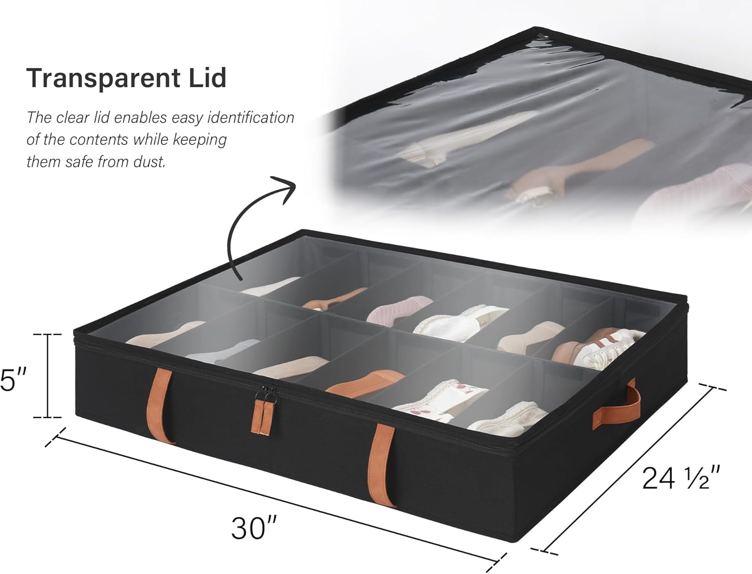 - Measuring 30" L x 24 ½" W x 5 ¼" H, these underbed shoe storage organizers can hold up to 24 pairs of shoes with ease (12 each) and are perfect for storing various kinds of shoes such as sneakers, loafers, sandals and flat shoes.