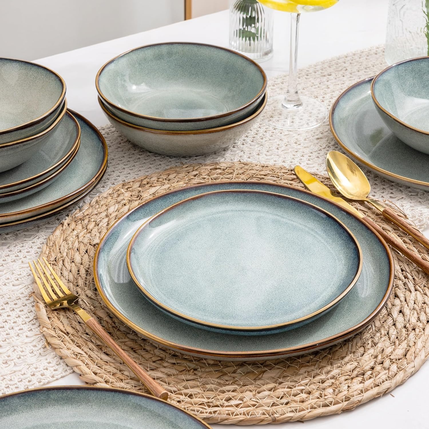 - EVERY PLATE IS UNIQUE: This dinerware set are fired with two different glazes, so the surface develops a beautiful color and makes your food look even more delicious.Since our glaze is all-natural, the surface of plates would change color on different lighting. The color may be a tad different from what you see in the images,but very item is betiful.Our glaze is also extra strong to prevent scratches from your knives and forks