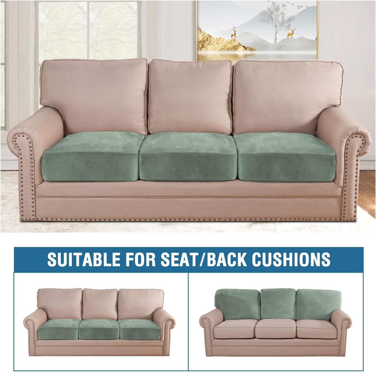 H.VERSAILTEX Velvet Stretch Couch Cushion Cover Plush Cushion Slipcover for Chair Loveseat Sofa Cushion Furniture Protector Seat Cushion Sofa Cover (3 Piece Sofa Cushion Covers, Sea Grass)