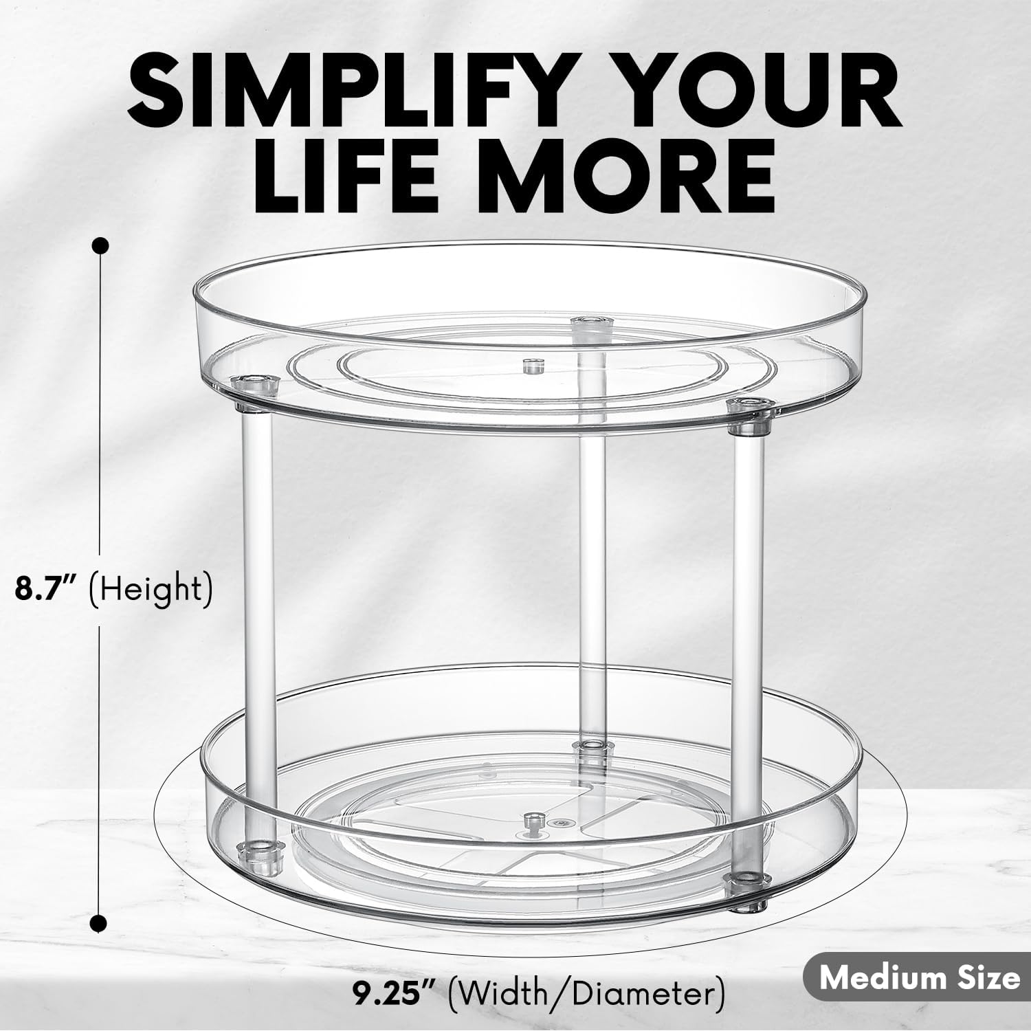 - COMPACT YET SPACIOUS - Our 2 tier lazy susan spice organizer boasts an impressive storage capacity for condiments, spices, makeup, skincare, perfume, cosmetics, and other small essentials, all while maintaining a compact footprint that won't overwhelm your space. At 9.25"W x 8.7"H, this turntable can fit seamlessly into your pantry, cabinet organizer, dresser, and fridge organization and storage.