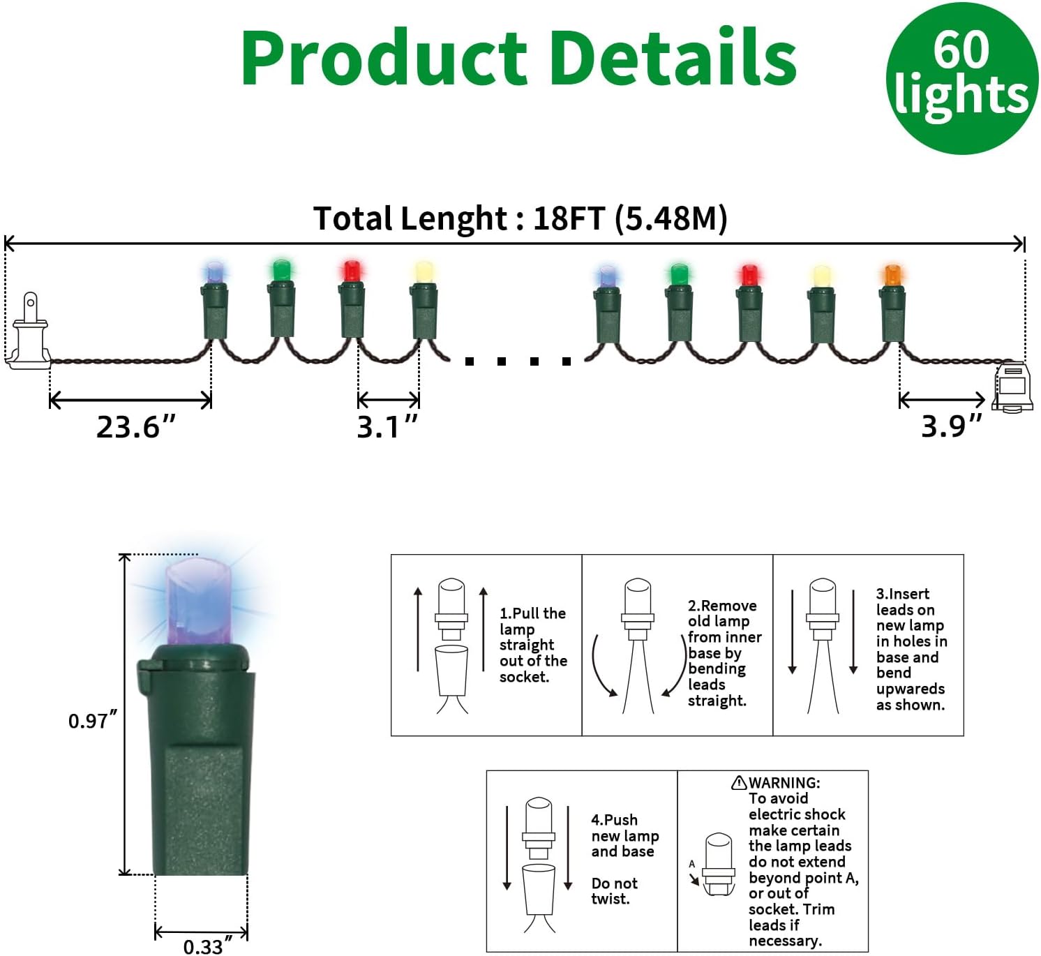 - 5mm LED Christmas Lights: 60 counts Multicolor 5mm wide angle stable LED string lights spaced 3.1 inches apart with green wire. 23.6 inch leads have a stackable male plug and 3.9 inch tails have a female plug for easy end to end connection.