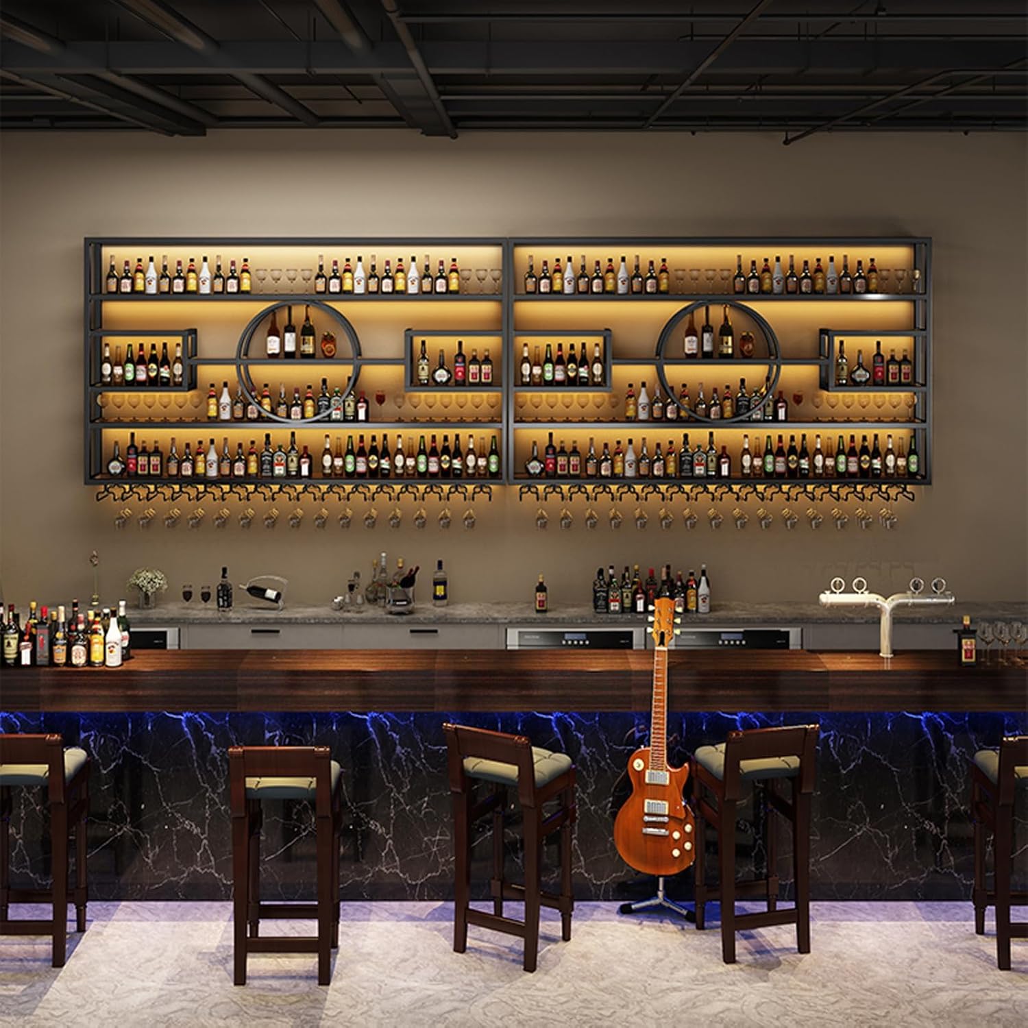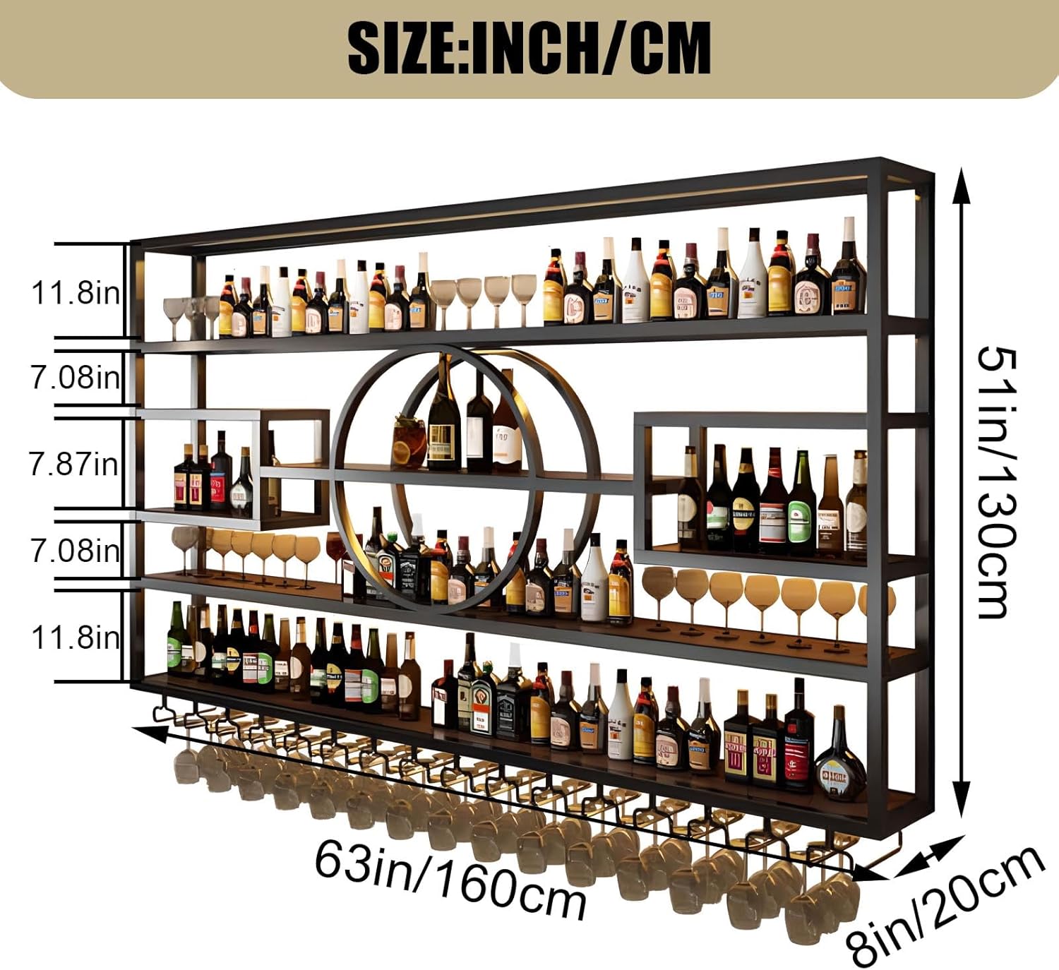 - γLarge Storage SpaceγThe wall-mounted wine rack can be used as a bar decoration or a large wine storage cabinet. This height can store most wines or spirits when we sit at a small bar to relax all day or have a party. The wine glass rack is sturdy enough to hold more wine glasses. The wine rack doubles as a large storage rack, making the space look neat and organized