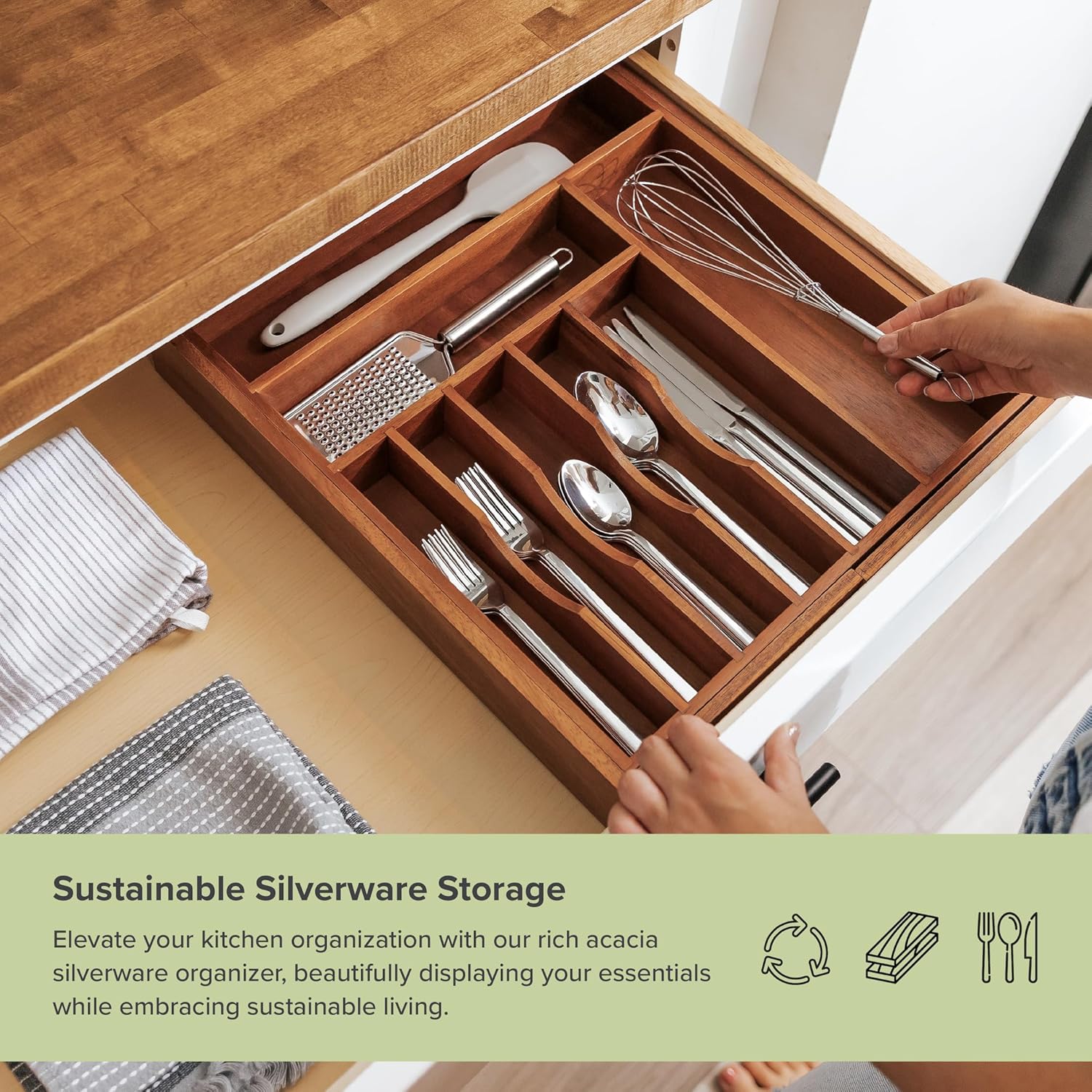 Premium Silverware, Flatware and Utensil Organizer for Kitchen Drawers, Food-Safe Contract Grade, Expandable from 16 to 28 In, Natural Acacia