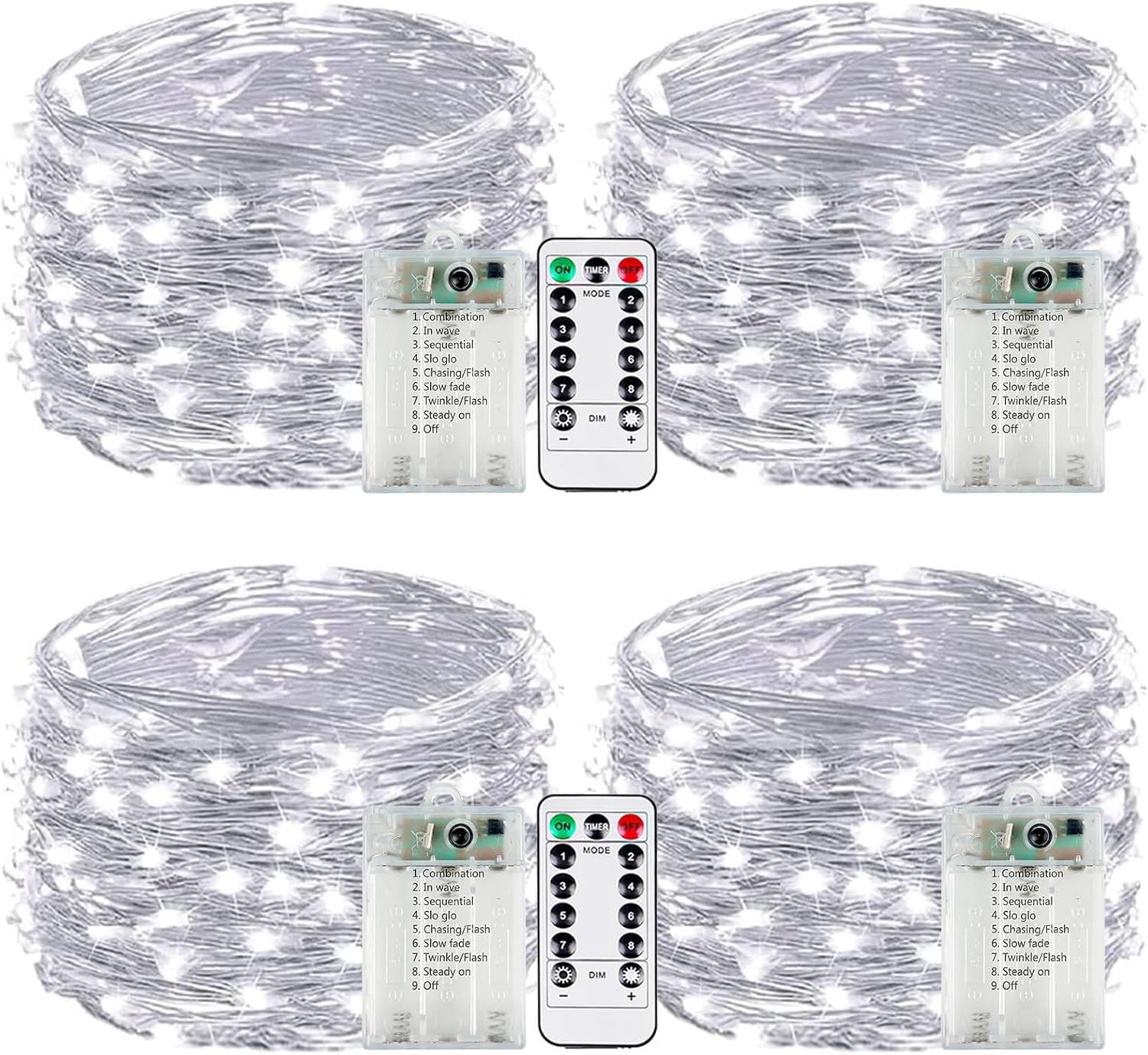 4-Pack Fairy Lights Battery Operated with Remote & Timer & 8 Modes, Waterproof 16 FT 50 LED String Lights Outdoor Indoor, Battery Twinkle Lights for Christmas Bedroom Centerpiece Décor (Cool White)
