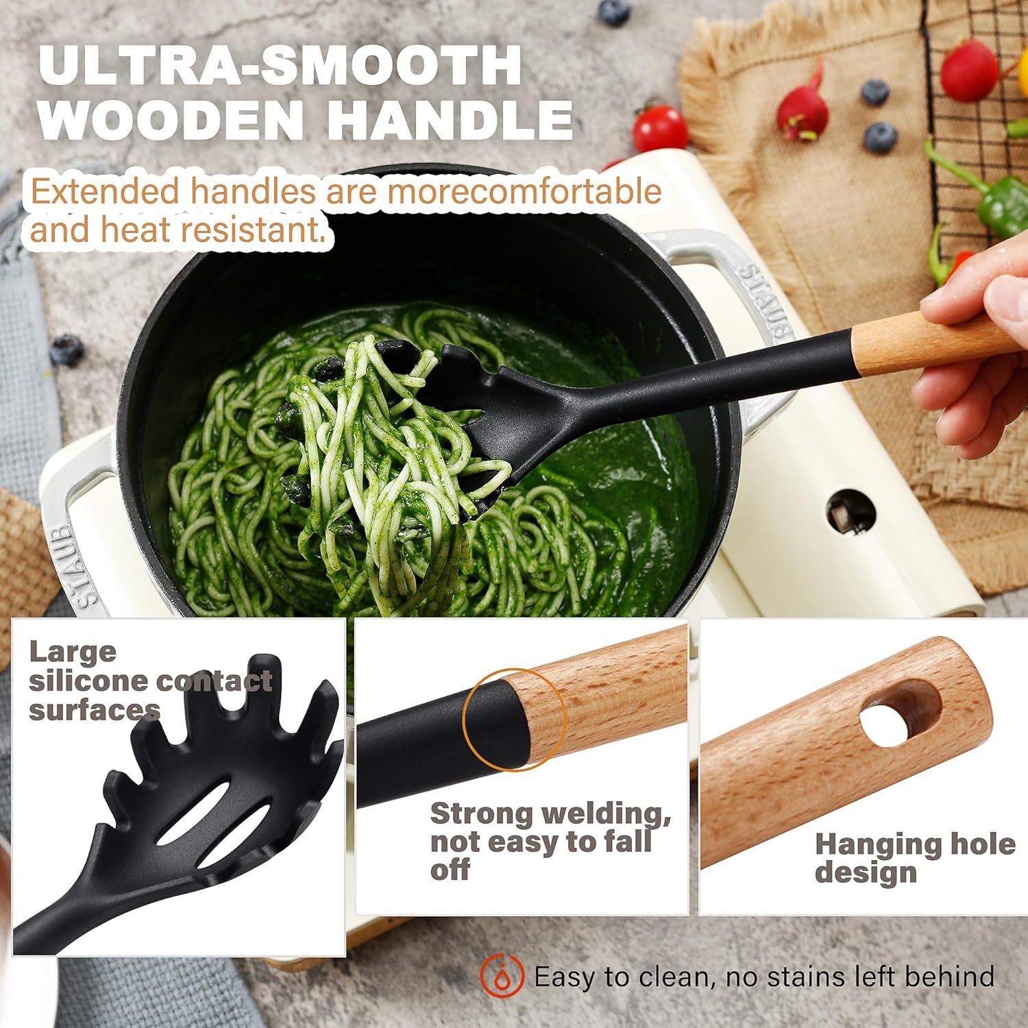 - EASY TO CLEAN: Our cooking utensils set is made of food-grade silicone. The silicone smoothly connects to the wooden handles without gaps, making cleaning easy. Because of the wooden handles, we suggest not putting them in the dishwasher or soaking them in water for too long