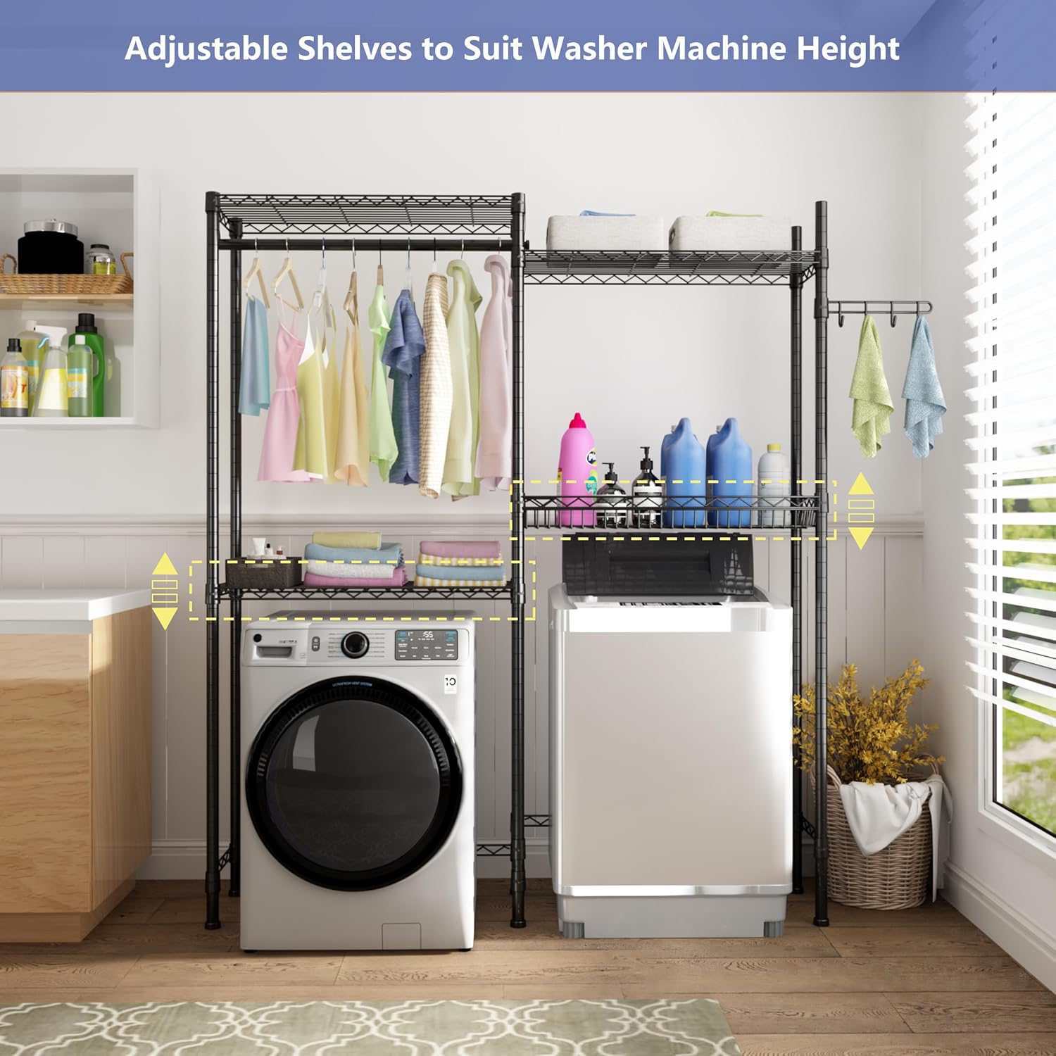 - Space-Saving and Versatile Design: Elevate your laundry organization with our multi-functional storage solution. The overall dimensions of 63.5โW x 13.4โD x 77โH ensure a perfect fit for washers and dryers up to 30.5" in width. This practical rack includes 3 wire shelves, 1 hanging rod, 1 wire basket, and 1 rotatable hook, adding extra space and organization to your laundry room. The upper crossbar design facilitates easy hanging of clothes, while the rotatable hook allows you to hang light clothing, towels, or cleaning supplies(Please note the appropriate size for the washer and dryer and purchase according to the required dimensions)