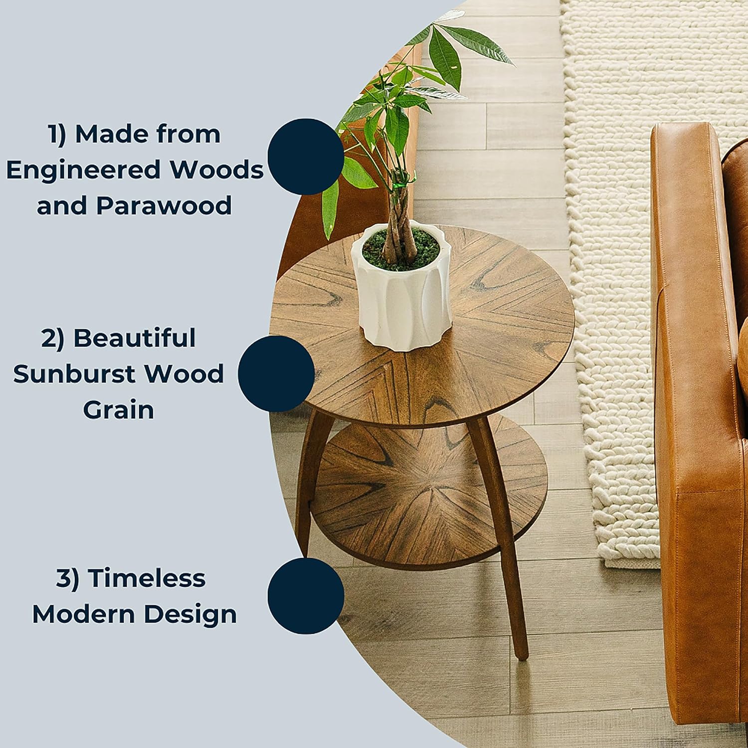 - STUNNING MID-CENTURY MODERN DESIGN – Instantly transform your living space with this sleek round end table. This stunning nutmeg brown wood side table effortlessly combines retro charm and modern sophistication, resulting in a striking focal point that enhances any living room or den.