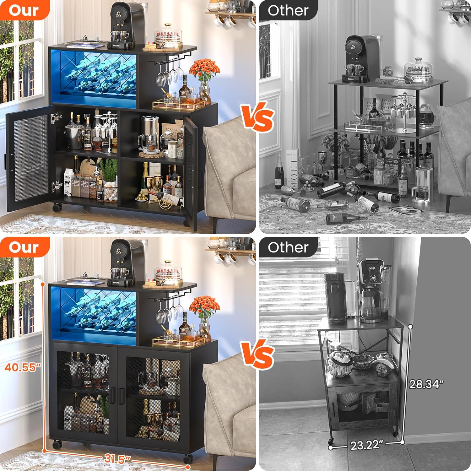 Wine Bar Cabinet with Wheels, Small Liquor Cabinet with LED Light, Home Bar Cart with Power Outlets, Coffee Bar with Wine Rack, Glasses Storage for Kitchen, Dining Room, Living Room, Black