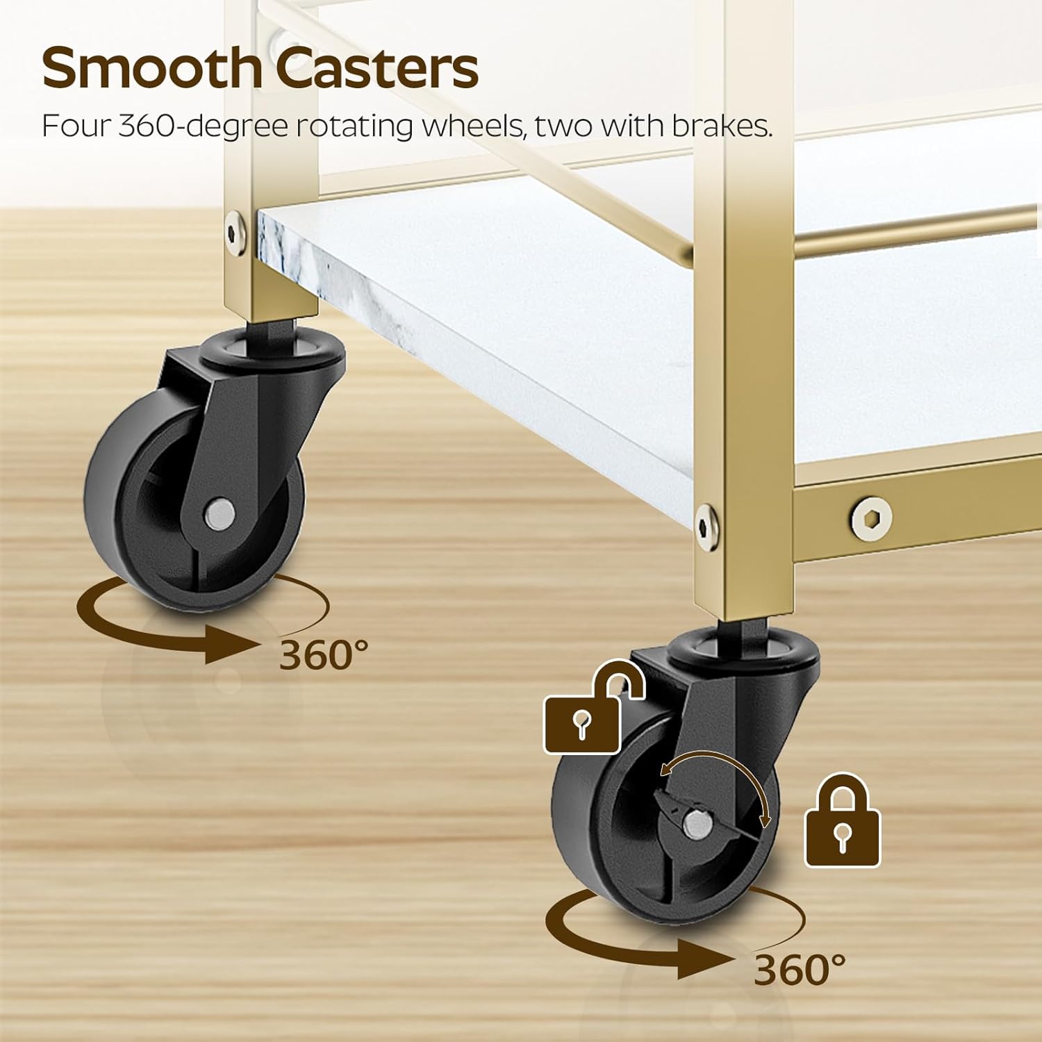 - Luxurious and Stylish: The gold bar cart adopts marble white patterned panels with a gold frame. Emphasizing modern simplicity with a touch of luxury, it enhances the overall color scheme of the space, impressing everyone who lays eyes on it