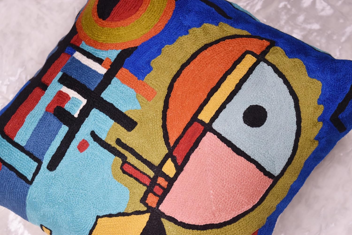 - β€ Modern Throw Pillow Cover - Hand Embroidered: Our vibrant decorative abstract pillow covers draw inspiration from Kandinsky's artistry and are meticulously hand-embroidered using soft wool. Our skilled artisans devote painstaking attention to detail, creating an extraordinary abstract contemporary pillow that enhances your home decor. An up-close look at this contemporary accent pillow reveals the exquisite craftsmanship of fine chain-stitch hand embroidery.