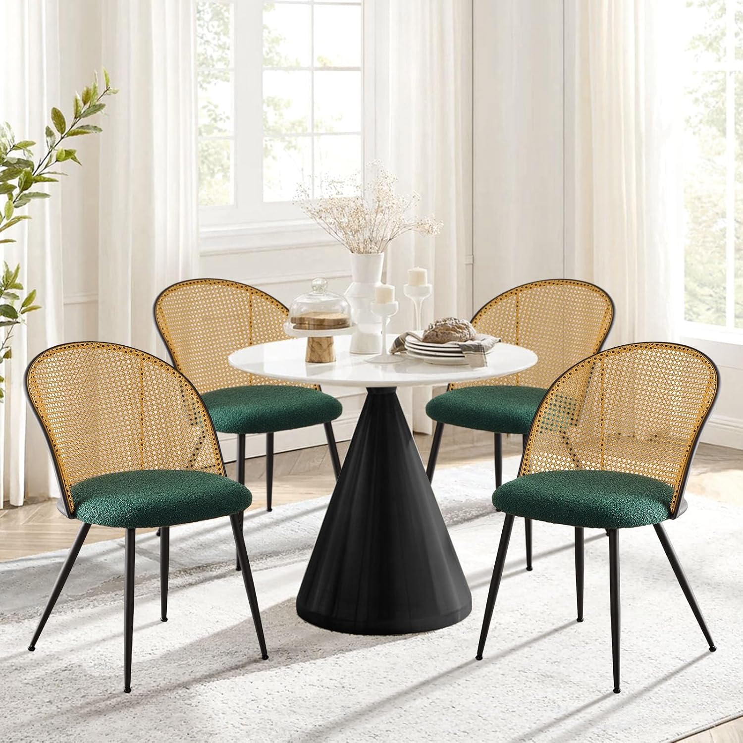 Rattan Dining Chairs Set of 4, Mid-Century Modern Kitchen Dining Room Chairs with Full Cane Backrest Armless Upholstered Farmhouse Boucle Dining Chairs with Metal Leqs for Dining Room, Green