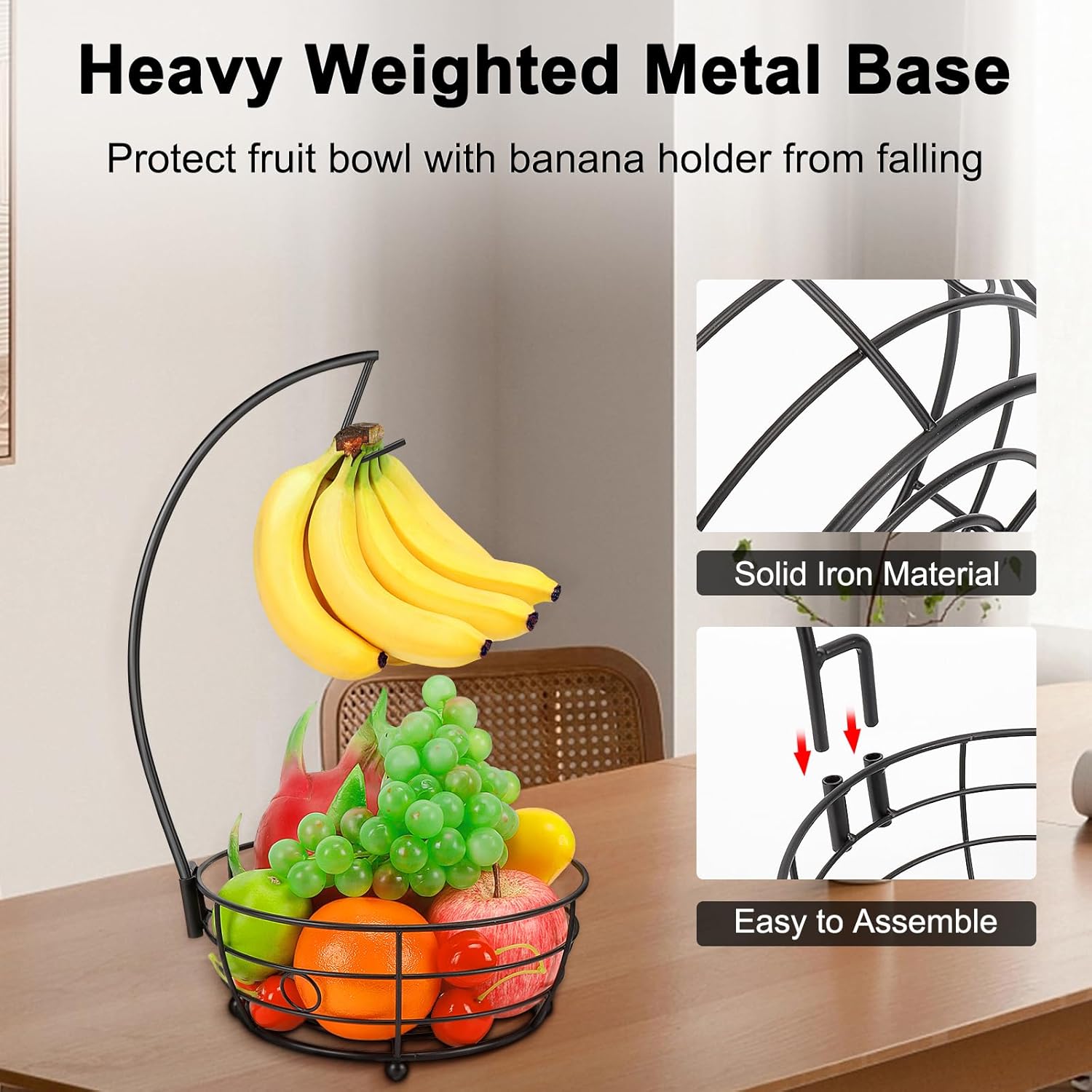 - THICKEN IRON BASE: Heavy weighted design of base is stable to protect fruit basket from falling when take out bananas, which is well-balanced.